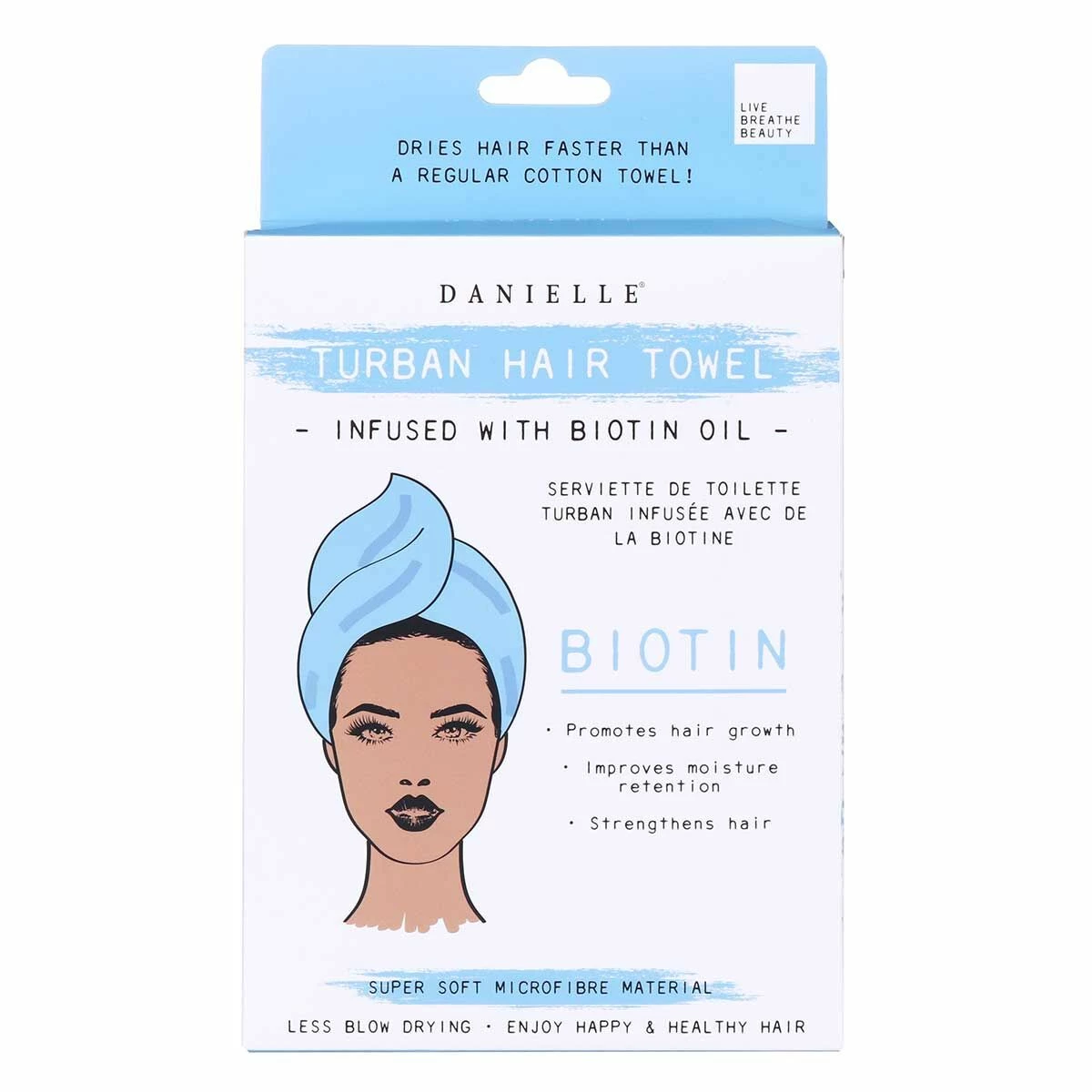 Simply place it over your head when getting out of the bath or shower, twist the towel and then secure it by using the button. This gentle towel will allow hair to dry faster and save you time by avoiding blow-drying. The turban hair towel is sealed to retain Biotin oil which is enriched with nutrients that will help support hair growth, strengthen your hair, and improve moisture retention.