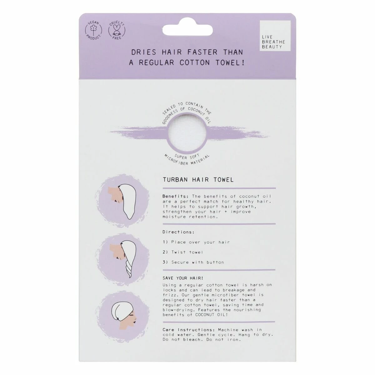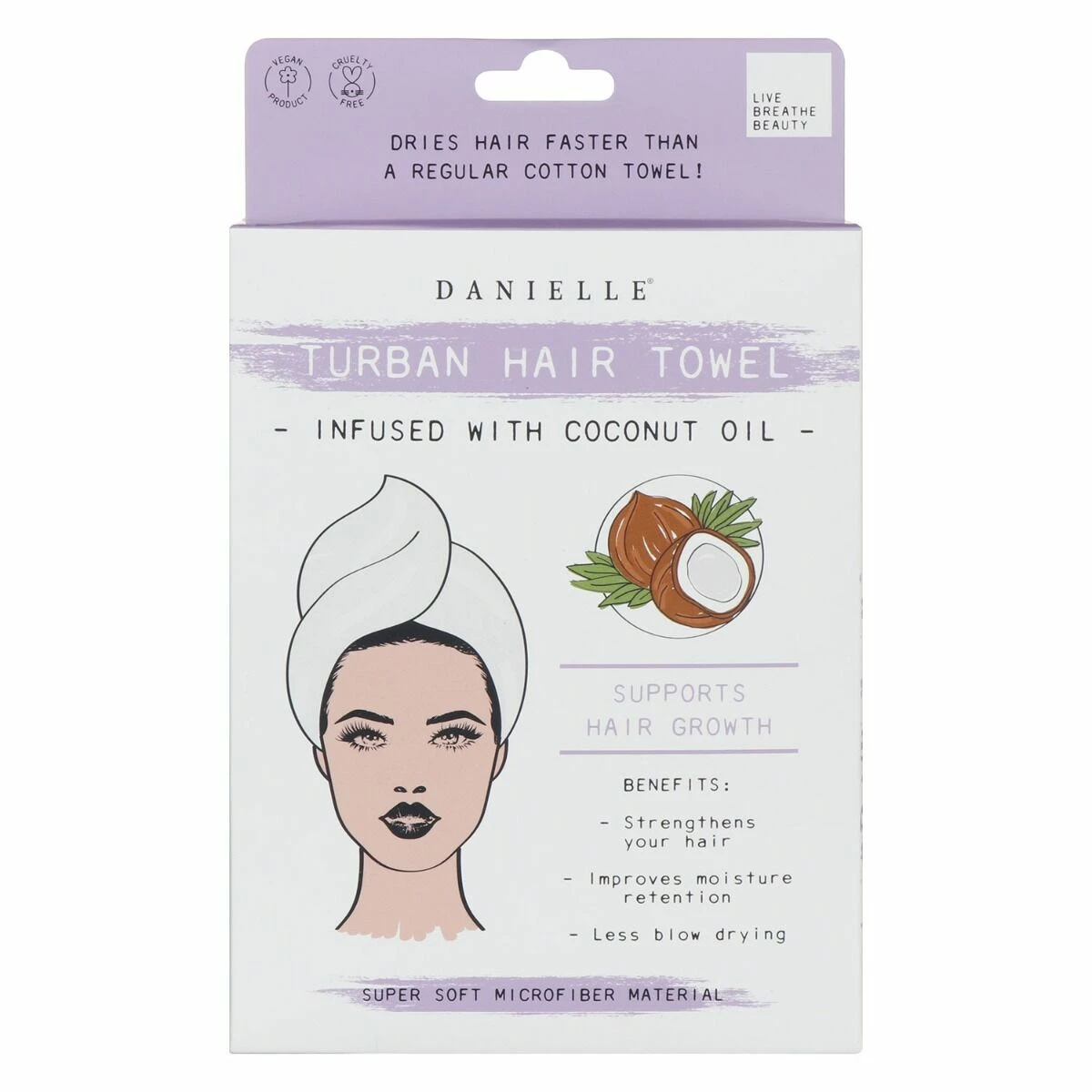 Simply place it over your head when getting out of the bath or shower, twist the towel and then secure it by using the button. This gentle towel will allow hair to dry faster and save you time by avoiding blow-drying. The turban hair towel is sealed to retain coconut oil which is enriched with nutrients that will help support hair growth, strengthen your hair and improve moisture retention.
