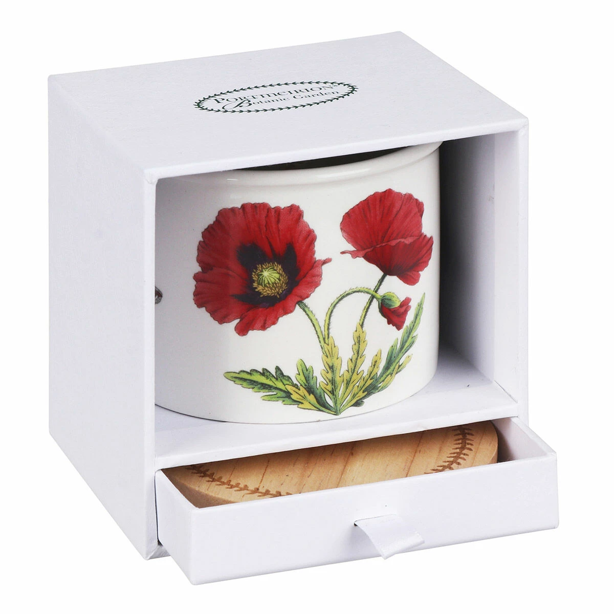The candle comes in a ceramic candle holder which is adorned with vibrant red poppies, accompanied by a little butterfly, all set against a crisp white background. There is also a circular wooden lid that features a circle of embossed leaves. You can put the lid on top of the pot when you have finished with the candle and reuse it for your trinkets.