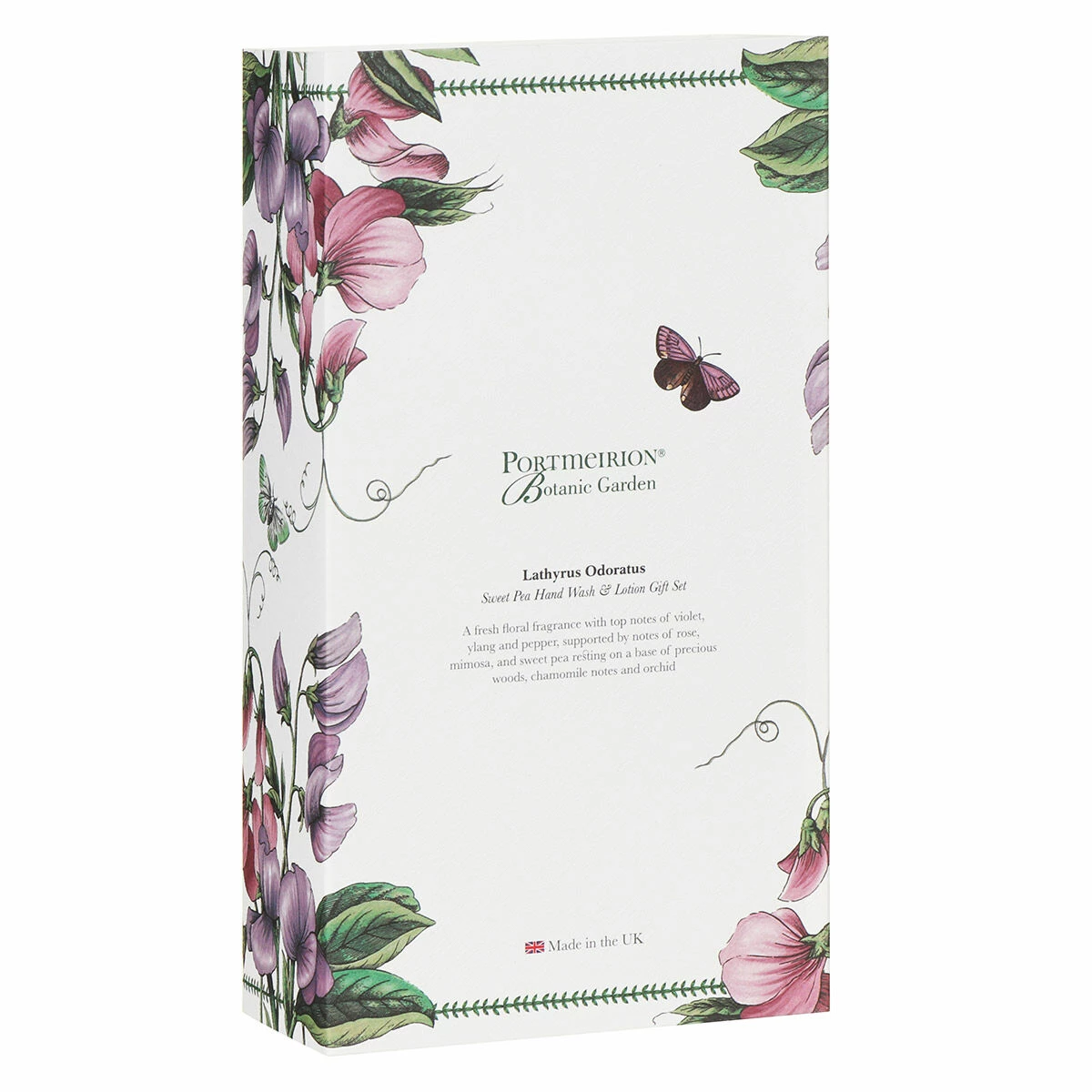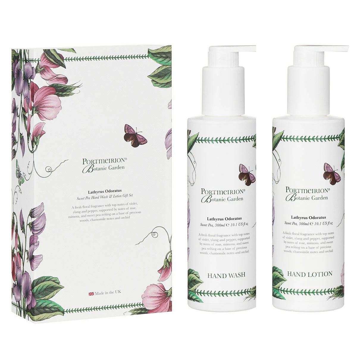 Each bottle holds 300ml of liquid and comes in a sleek bottle with hand pump lid for easy use at the side of a basin or on a dresser. The bottles are adorned with a border of laurel with illustration of stunning sweet peas accompanied by a butterfly, all set against a crisp white background.