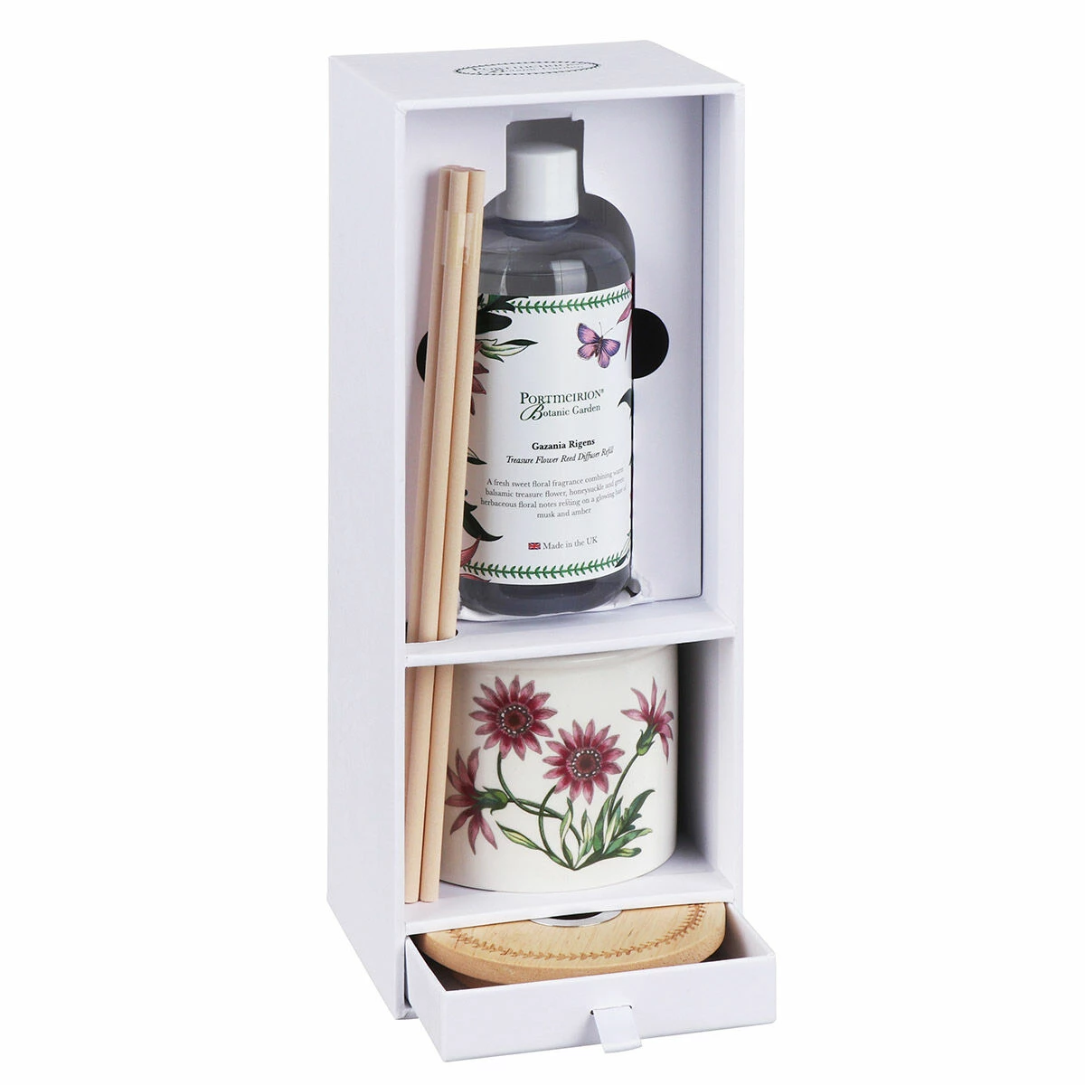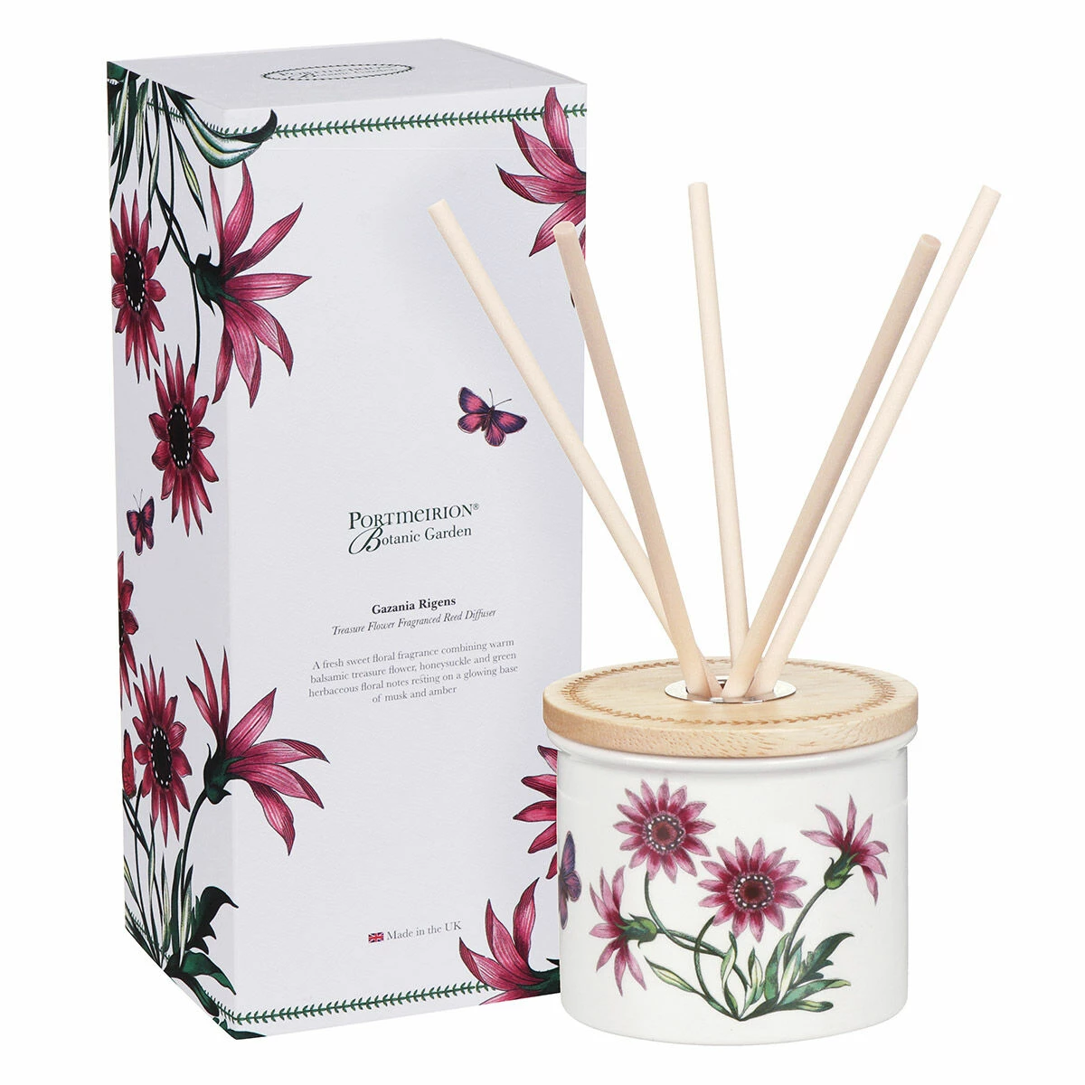 The luxury ceramic diffuser is adorned with pink gazania or treasure flowers, accompanied by a little butterfly all set against a crisp white background. The ceramic holder comes with a wooden lid, adorned with a circle of embossed leaves, and 5 fibre reeds along with a 200ml bottle of fragrance.