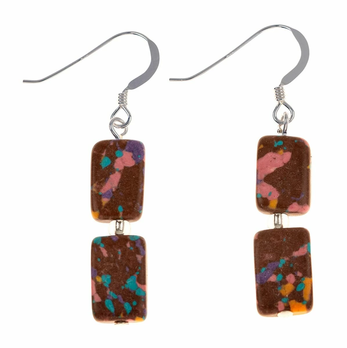 Add a pop of colour to your outfit with these gorgeous ceramic mosaic rectangles earrings, from Carrie Elspeth, in shades of beautiful aubergine. The stunning drop earrings are beautifully shaded in brown with mottled purple, pink, yellow and teal to create a truly unique pattern. Two rectangular beads are strung on a thin piece of silver wire with a little clear spacer bead in between allowing the statement beads to stand out.