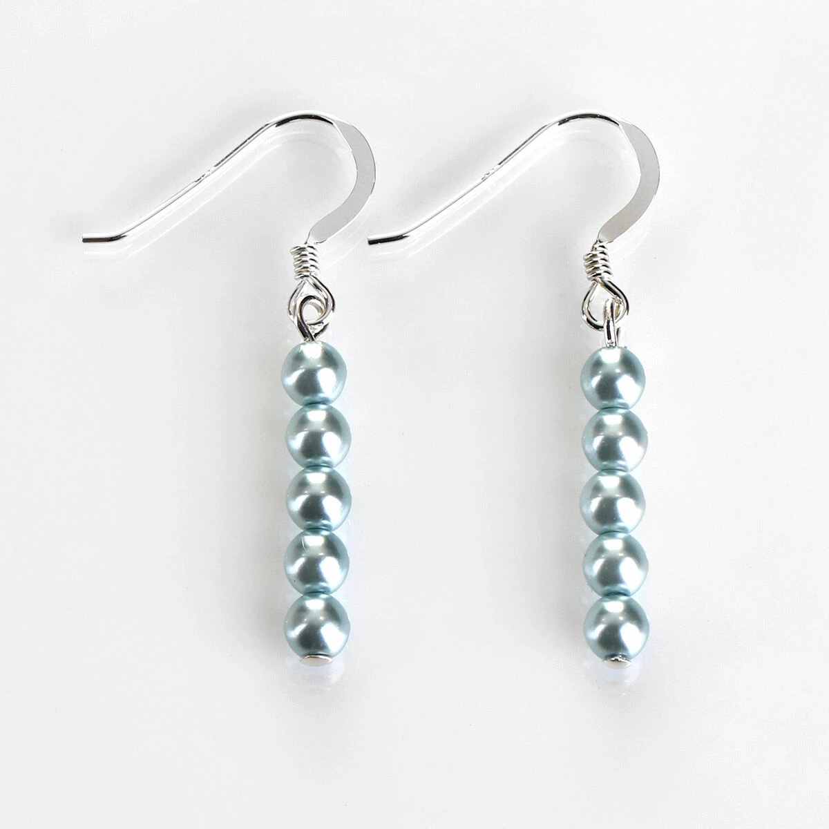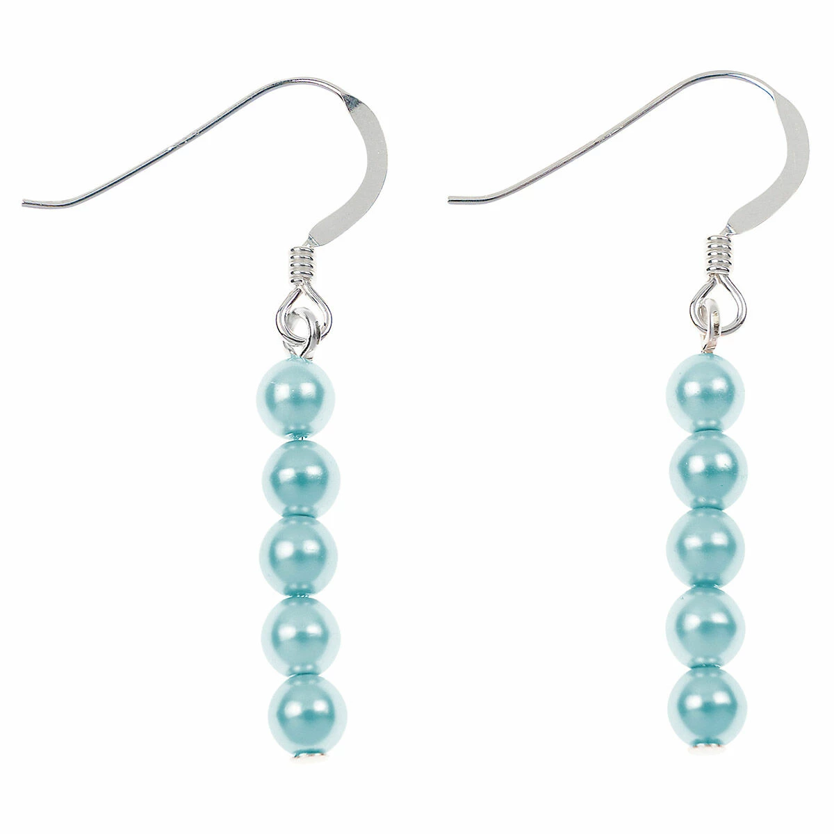 Add a pop of colour and a touch of elegance to any outfit with these classic pearl drop earrings with a modern twist. Each earring is decorated with a row of small pearlized glass beads in light shades of blue that shimmer and sparkle.
