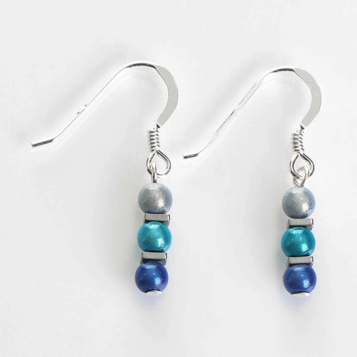 The stunning drop earrings are made from three shades of blue miracle beads; silver, pale blue and deep blue. Each small round bead has a shiny finish and is separated by a silver square haematite bead which creates a sophisticate charm. Combine these with the matching bracelet and earrings to complete your look.