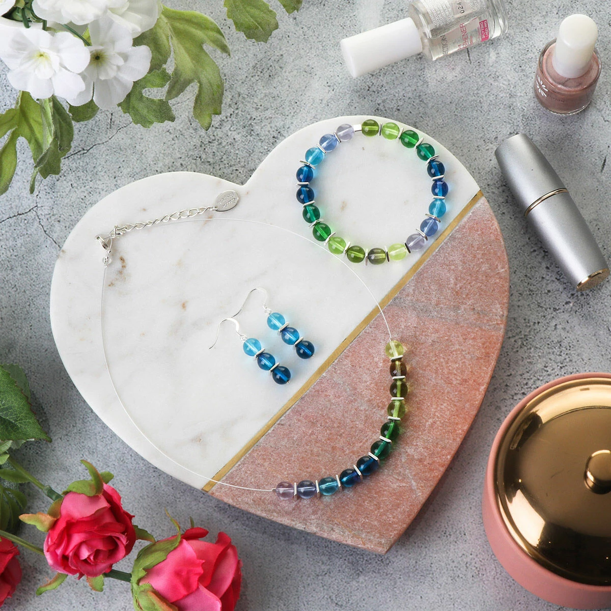 This stunning breeze rainbow bracelet from Carrie Elspeth features little, glass spheres that gleam in a mesmerising blues and green, interspersed with flat silver square beads. This beautiful design covers the whole elastic which expands to fit over your hand. The breeze rainbow globes bracelet is a gorgeous piece of jewellery which is perfect for adding a splash of colour to both daytime and evening wear, the vibrant colours will complement any outfit! Combine with the matching necklace and earrings to create a unique and sophisticated look! A bracelet from Carrie Elspeth makes a wonderful gift for a friend or relative for any occasion.