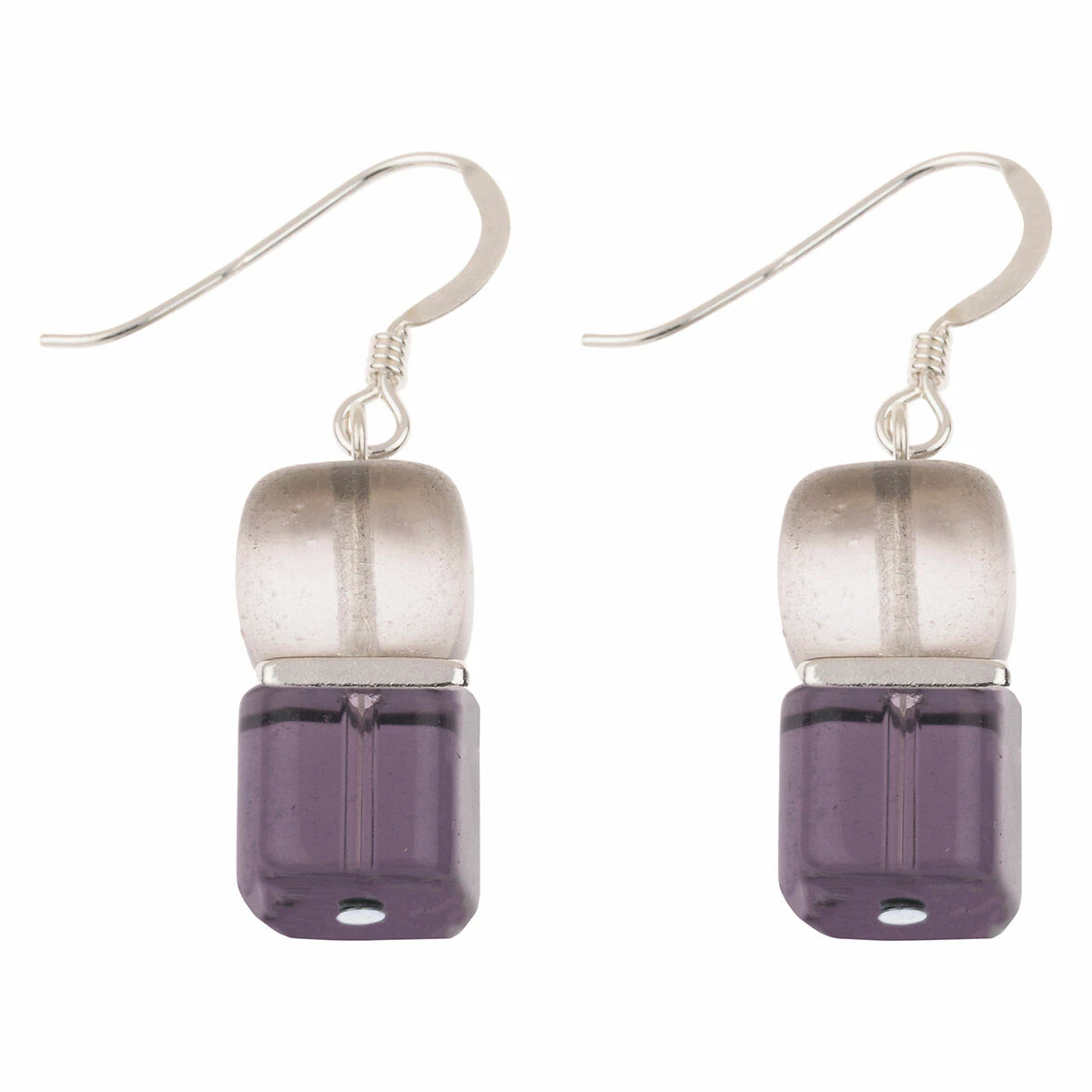 Make a statement and add a touch of elegance to any outfit with these beautiful earrings from Carrie Elspeth! Each earring features a purple Czech Glass cube nestled beside a pewter square, hanging from a sterling silver hook. This lovely pair of earrings the perfect way to compliment your day and evening wear to create an effortlessly chic look. Combine with the matching bracelet and necklace to create a stylish set.