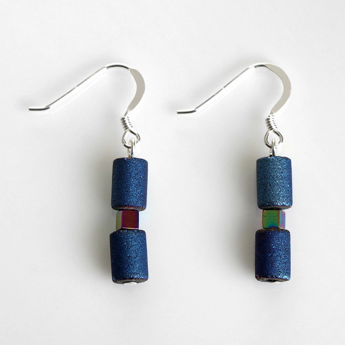 Add a glimmer of sparkle to your outfit with these stunning cobalt lava glimmer earrings from Carrie Elspeth. The gorgeous drop earrings are beautifully made with fired glass, barrel beads in the shape of a small cylinder with a glittering finish. They feature three, small cylinder beads which are interspersed with spectrum cube spacer beads. They are strung on a thing piece of silver wire, allowing the statement beads to come into their own.