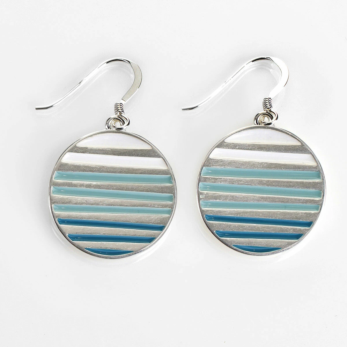 These timeless drop earrings from Carrie Elspeth make the perfect statement piece to add to touch of elegance to any outfit! They feature a single striking enamel pendant with a gradient of complimentary cool blue sunset tones that is attached to a sterling silver hook.