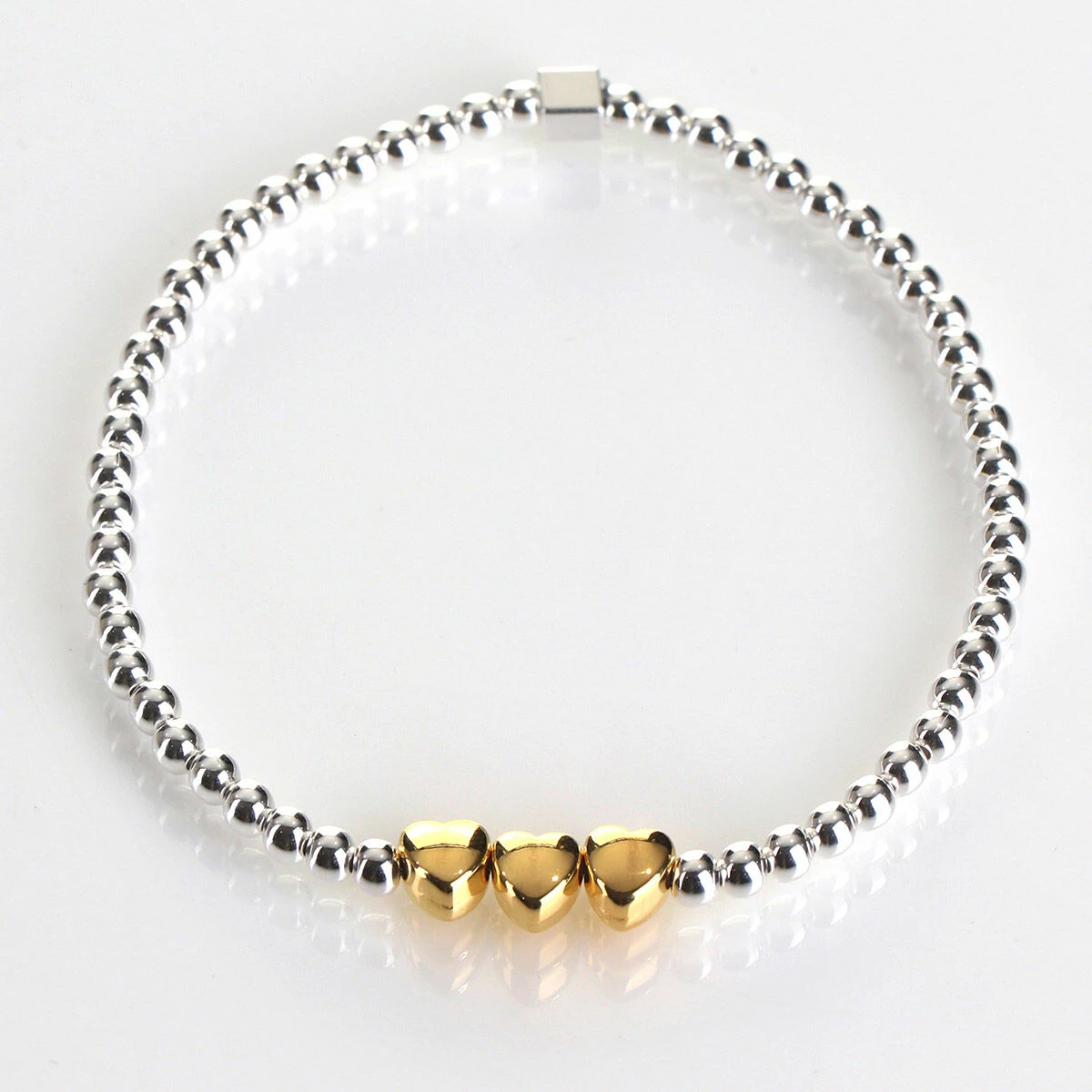 Celebrate a special friendship with this utterly charming bracelet from Carrie Elspeth. The bracelet features silver beads and a trio of adorable heart shaped charms that are gold-plated and shimmer in the light. The bracelet stretches to fit over your wrist allowing it to be put on and taken off with ease.