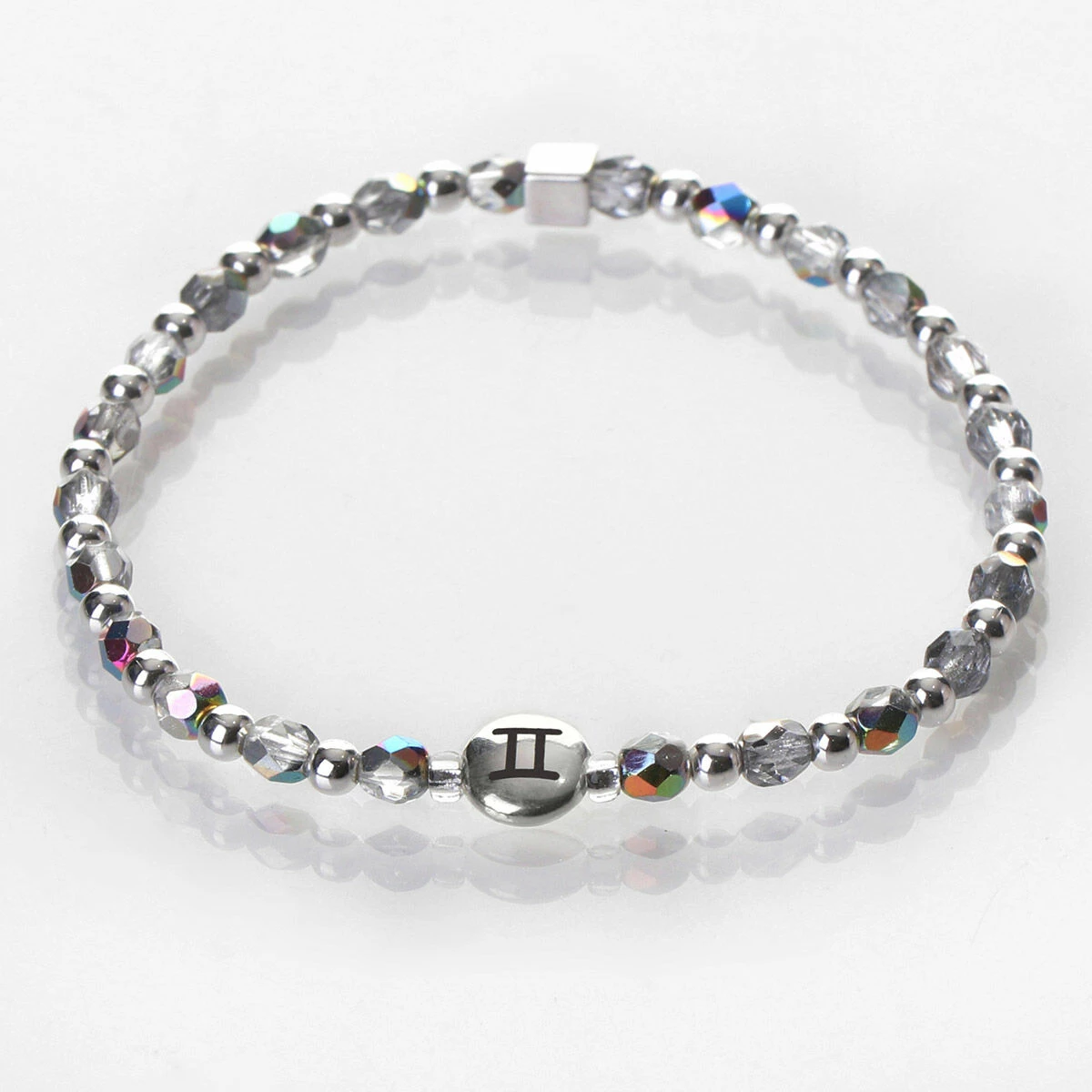 Send heartfelt thoughts to a Gemini friend with this charming bracelet from Carrie Elspeth. The zodiac bracelet features shimmering Czech beads spaced with silver beads, and a cute silver-plated charm bead with the Gemini zodiac symbol embossed on the front which hangs in the middle. The bracelet stretches to fit over your wrist allowing it to be put on and taken off with ease.