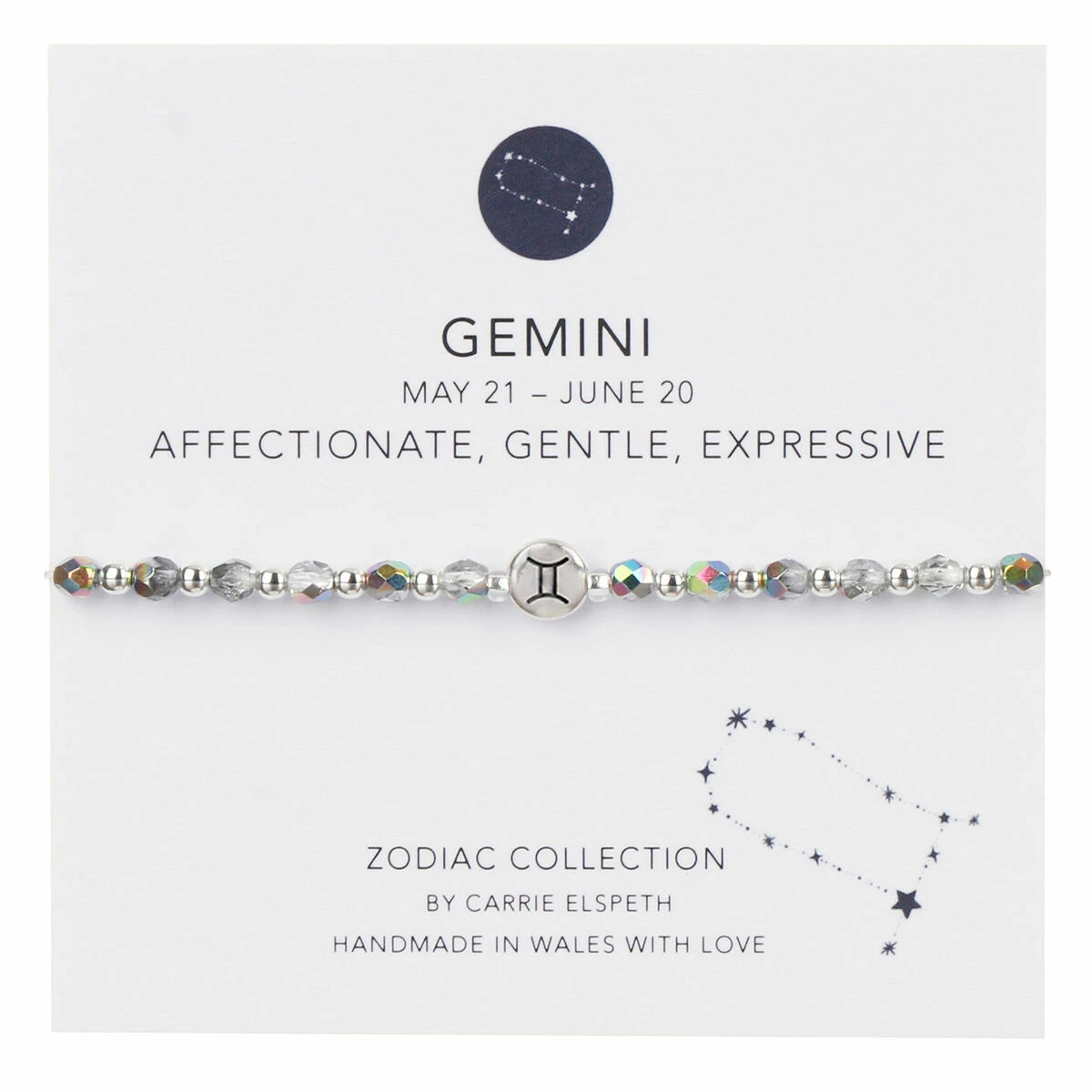 A ‘sentiment’ card is included with the bracelet featuring the Zodiac star formation along with the title; ‘Gemini’, ‘Affectionate, Gentle, Expressive’.