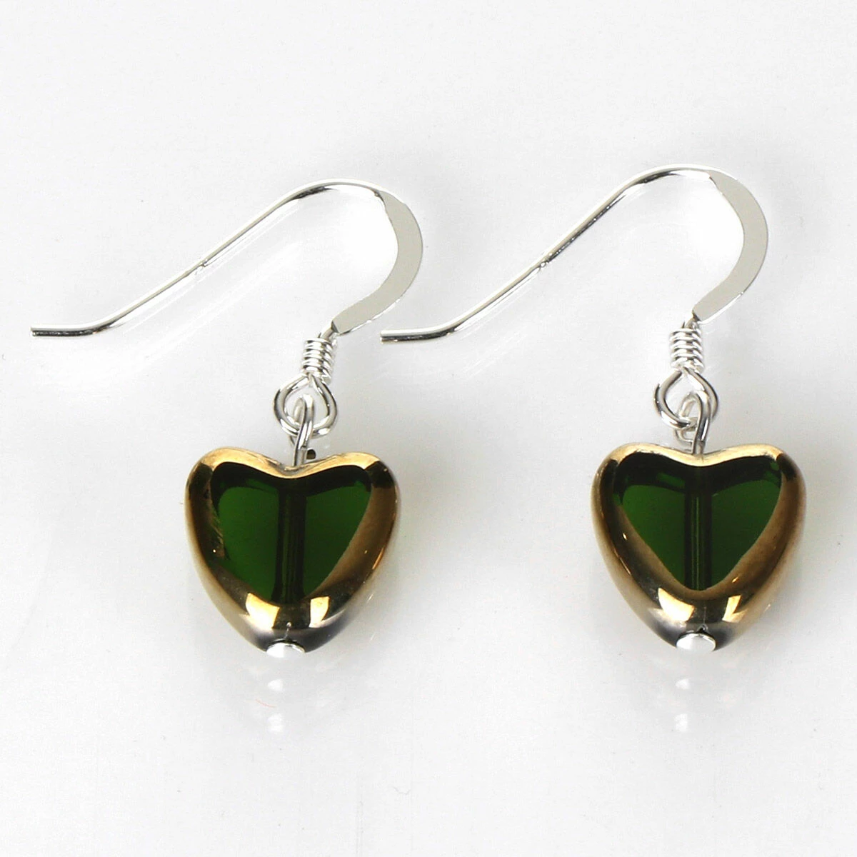 Add a pop of colour and a heartfelt touch to any outfit with these beautiful earrings from Carrie Elspeth! Each earring features a translucent green heart shaped bead with an electroplated gold edge, hanging from a sterling silver hook. This lovely pair of earrings the perfect way to compliment your day and evening wear. Combine with the matching bracelet and necklace to complete the look. They make a gorgeous gift for that special someone.