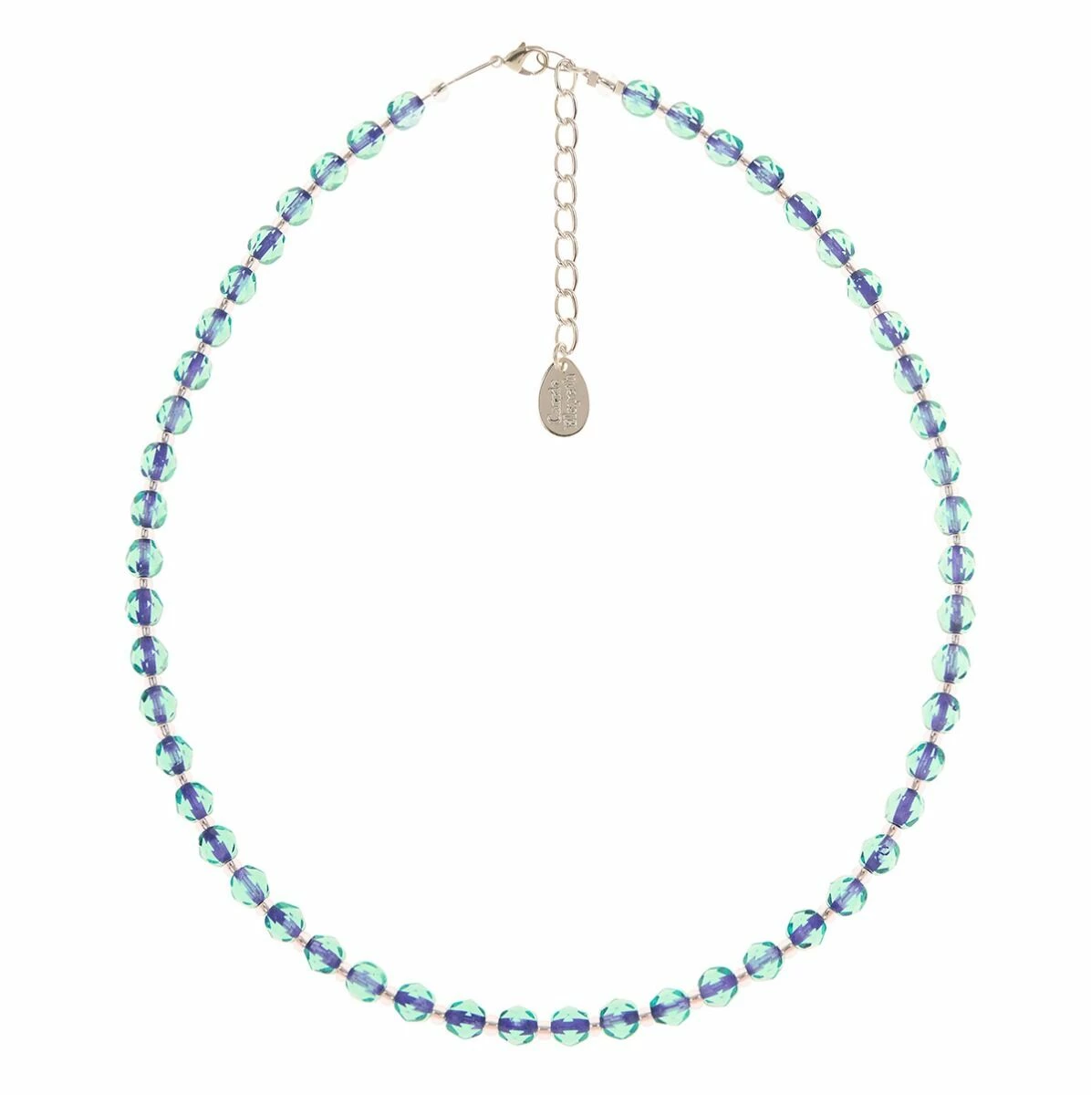Add a pop of colour and a touch of elegance to any outfit with this green & purple filament full necklace. These beads are made with luxurious fire polished glass beads with a contrasting-coloured core. The full length of the necklace is decorated with faceted beads in shades of translucent green with a line of purple running through the middle. Each faceted bead is separated with a small clear spacer bead, allowing the statement beads to stand out.
