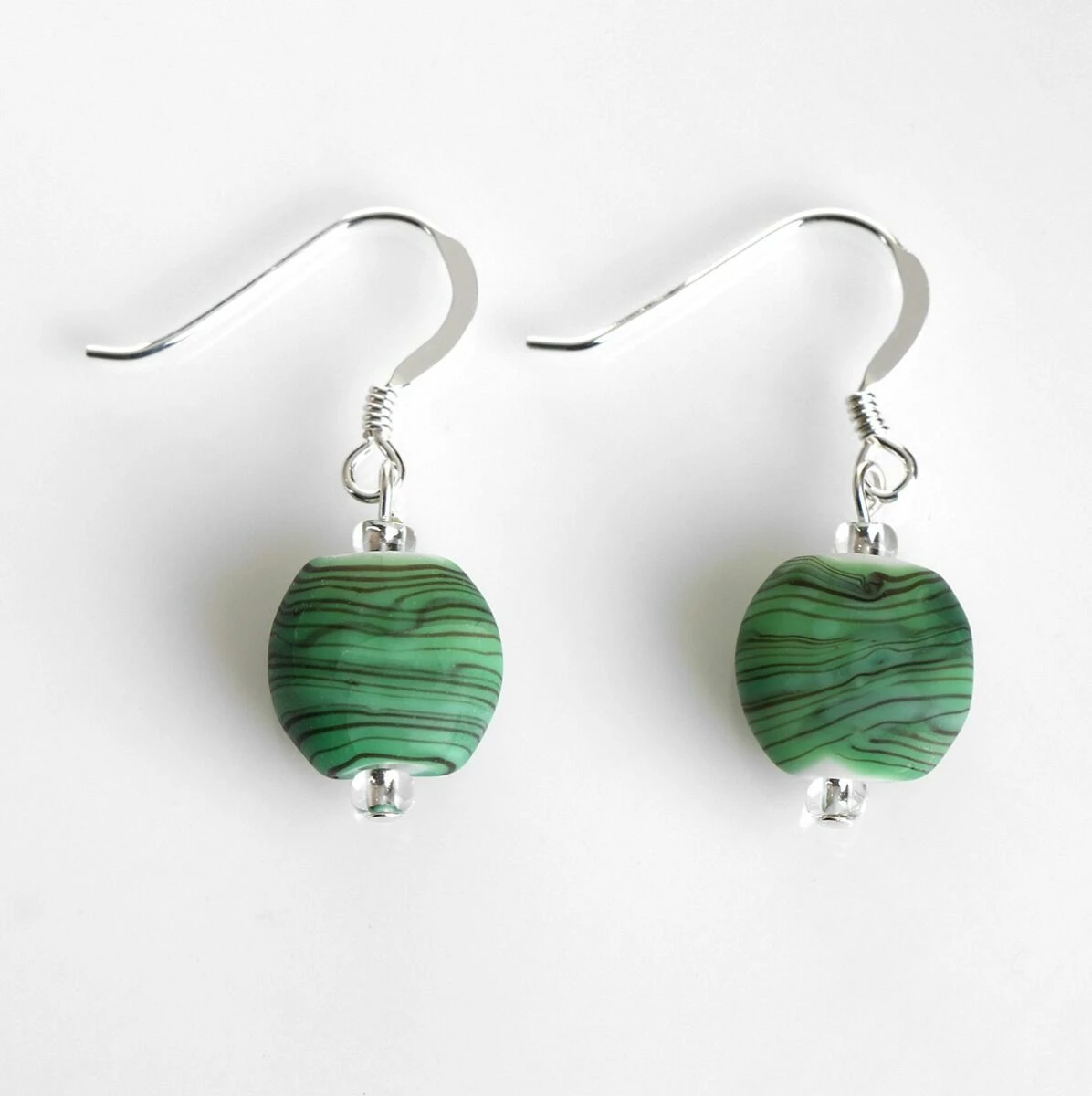 Add a pop of colour to your outfit with these strata earrings from Carrie Elspeth. These earrings are made from green glass beads featuring beautiful striations mimicking rock formations, each one individual and unique. The lovely drop earrings are beautifully made from flat round beads which have been decorated to form a gorgeous strata pattern. The single statement bead sits on top of a small clear spacer bead, allowing the green strata to stand out.