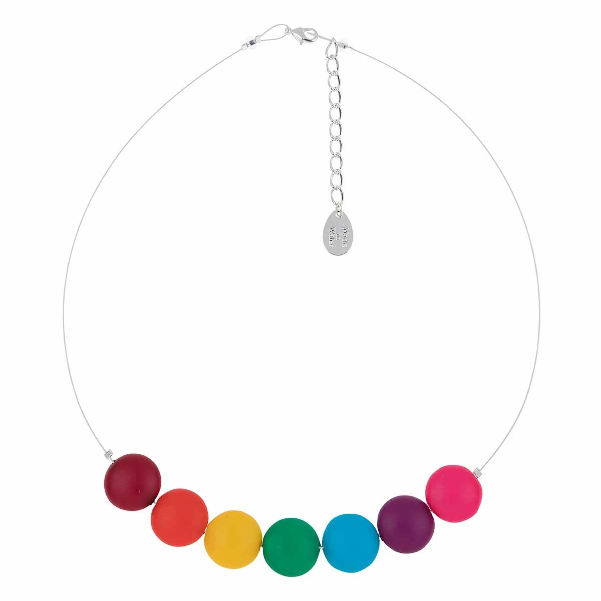 This beaded necklace is made from coloured matt glass discs which form a rainbow; from red, to orange, yellow to green, blue to purple and pink which sits in the middle of a thin silver wire. The necklace is fastened with a spring clasp complete with an extender chain. Combine this accessory with the matching necklace and earrings to complete your look.