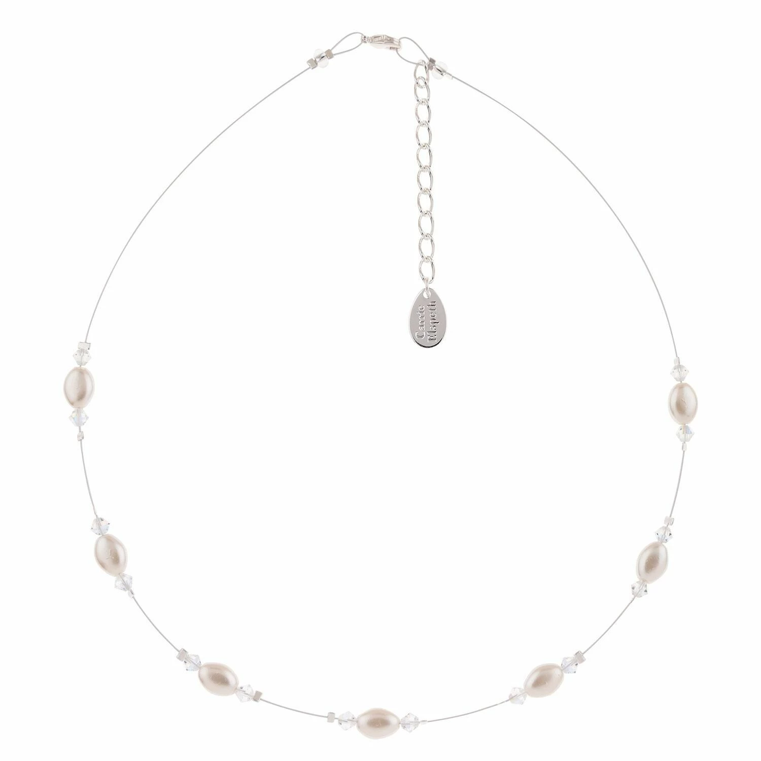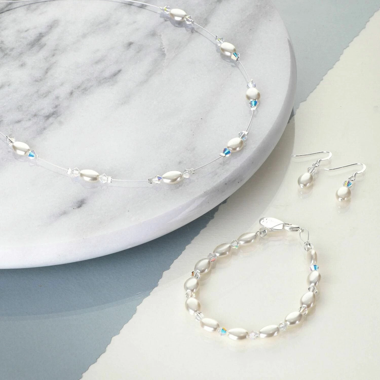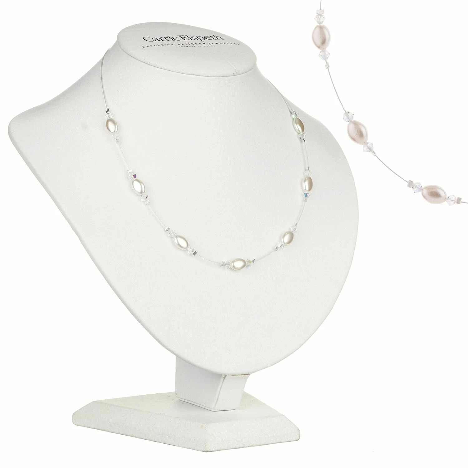 This delicate necklace from Carrie Elspeth is the perfect dainty accessory for any your special day! Made from pearls and Swarovski crystals, each pearl is oval in shape with an iridescent ivory pearl finish. They are strung on a thin piece of silver wire at regular intervals, accompanied by small clear faceted beads at either side and held in place with small silver clamp beads. This stunning necklace will add a touch of class to your jewellery collection and is perfect for finishing off any outfit, whether it’s a wedding, party or just an everyday outfit. Combine with the matching earrings and bracelet to create a sophisticated look.