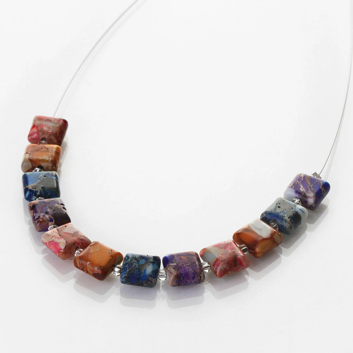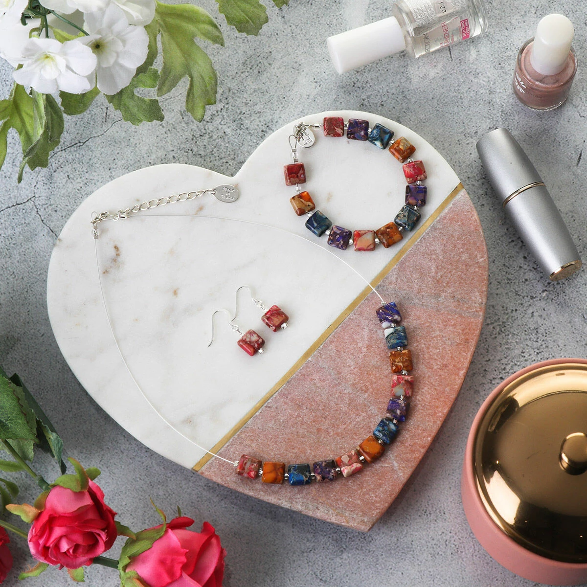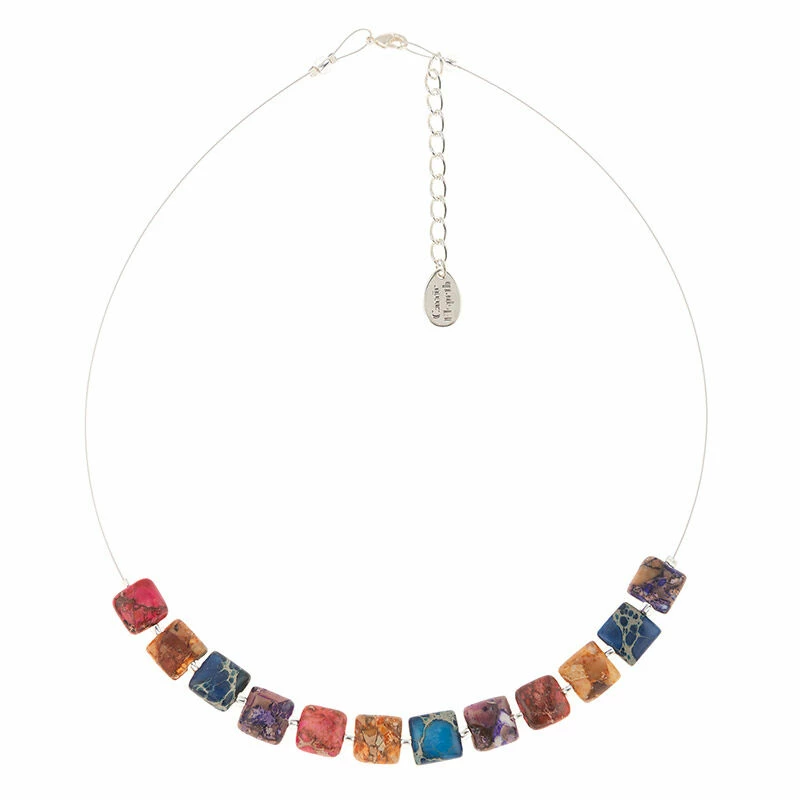 Add a splash of colour to your jewellery collection with this stunning necklace from Carrie Elspeth. Perfect for accessorising any outfit thanks to the rainbow hues that are showcased within the jasper pillow beads made from glass. These beads are square with slightly rounded edges and each one is decorated with a marbled finish. Strung on a thin piece of silver wire at regular intervals, the beads are interspersed with a small clear spacer bead allowing the coloured beads to stand out. Ink magenta, warm-yellow, aqua blue and indigo purple and are held in place by small, silver clamp beads.