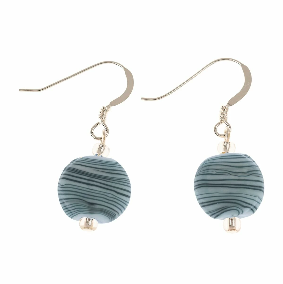 Add a pop of colour to your outfit with these strata earrings from Carrie Elspeth. These earrings are made from light blue glass beads featuring beautiful striations mimicking rock formations, each one individual and unique. The lovely drop earrings are beautifully made from flat round beads which have been decorated to form a gorgeous strata pattern. The single statement bead sits on top of a small clear spacer bead, allowing the light blue strata to stand out.