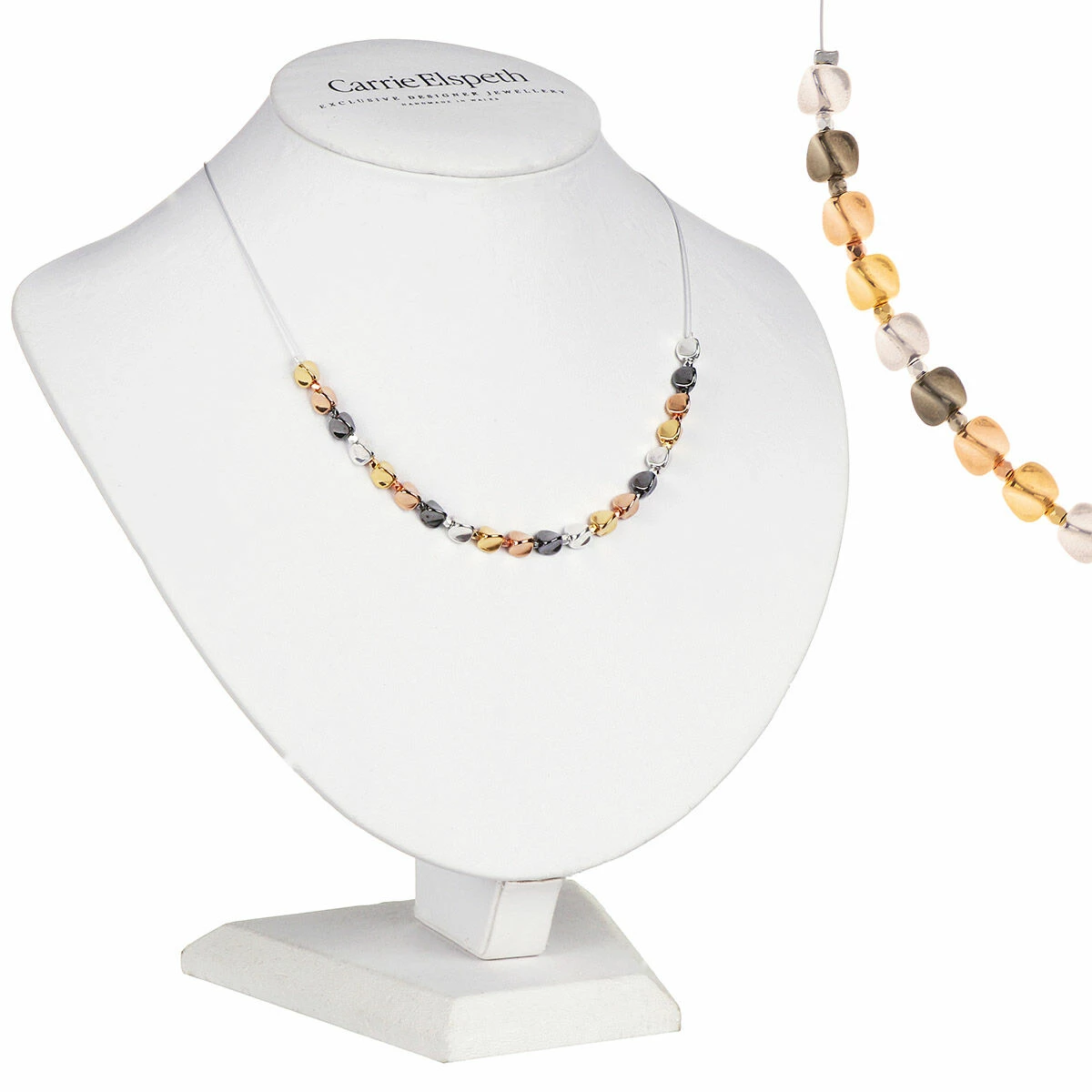 This stylish links necklace from Carrie Elspeth features striking metallic prism beads, made from fire polished crystals. Each bead is gold, silver, rose gold or mirrored slate, in a unique twisted prism shape. They are interspersed with a dainty matching faceted beads which allows the statement beads to stand out. The beads sit at the front of a single thin silver wire, whilst the metallic prism design finish will catch the light and add a touch of glamour to your outfit. A wonderful gift for anyone with a love for a bit of sparkle and class, perfect for gifting to a friend!