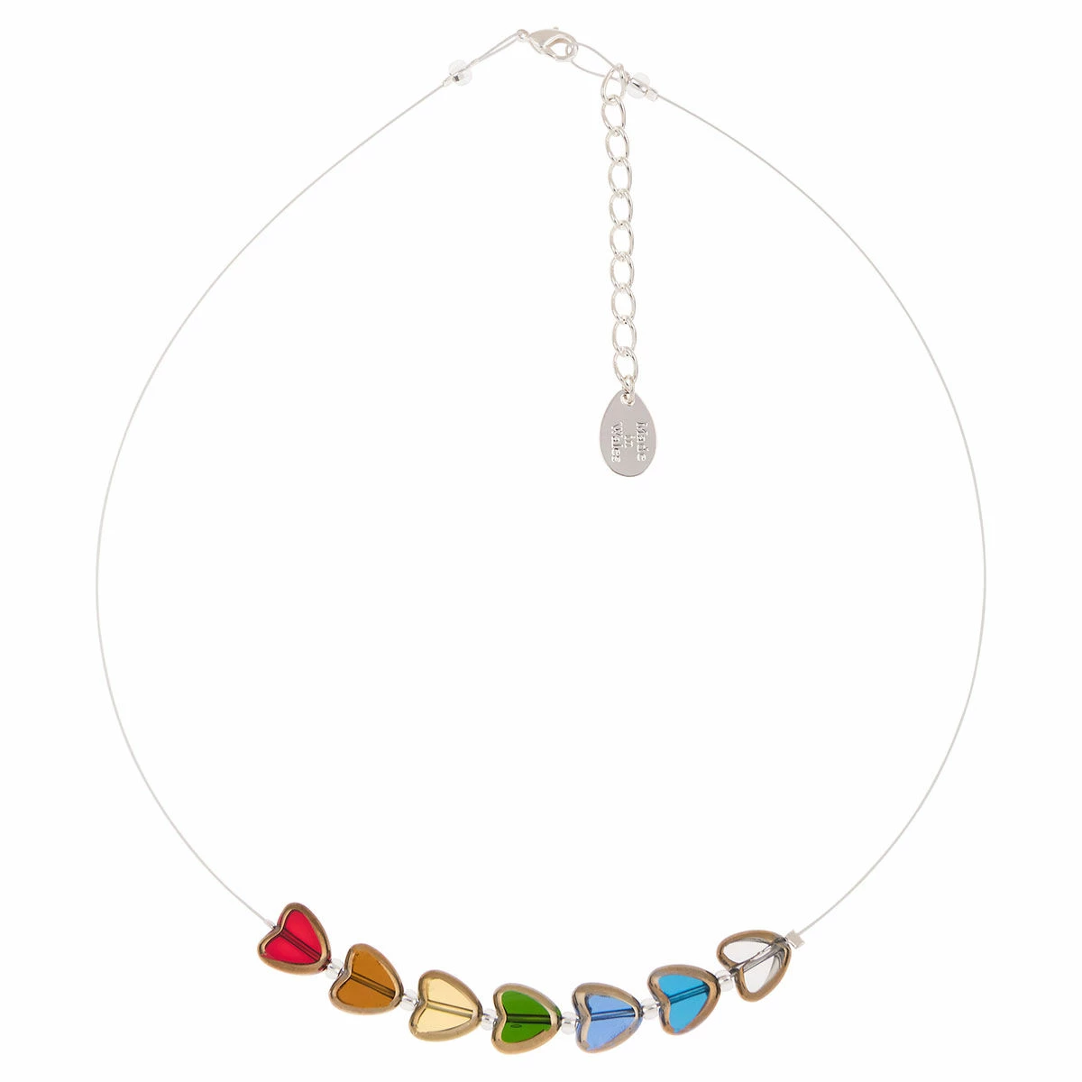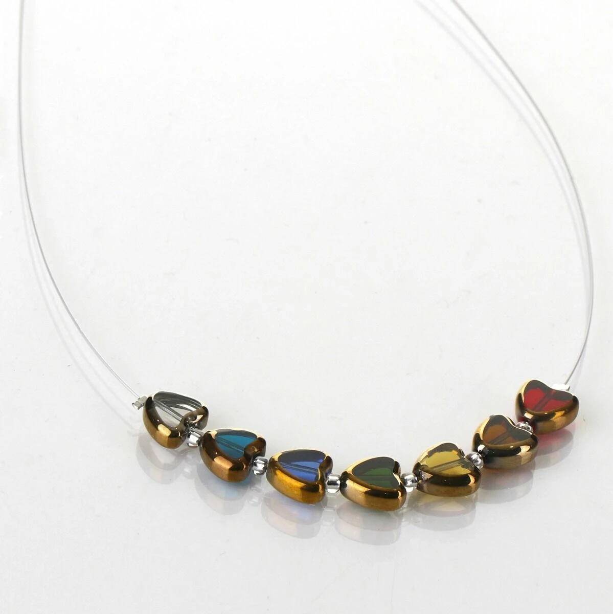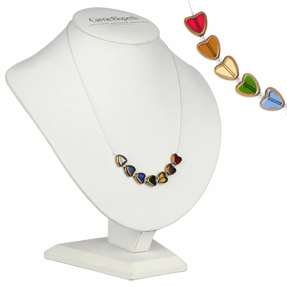 Add a heartfelt touch to any outfit with this beautiful necklace from Carrie Elspeth! Made from beautiful translucent multicolour heart-shaped glass beads with an electroplated golden edge, and alternated with petit spacer beads, this elegant necklace features beads that sit around the bottom of the dainty silver wire. The beads are held in place with a small silver clamp at either end. This decorative necklace is perfect for any formal or casual event, and will add a touch of class to your jewellery collection. Combine with the matching earrings and bracelet to create a sophisticated look.
