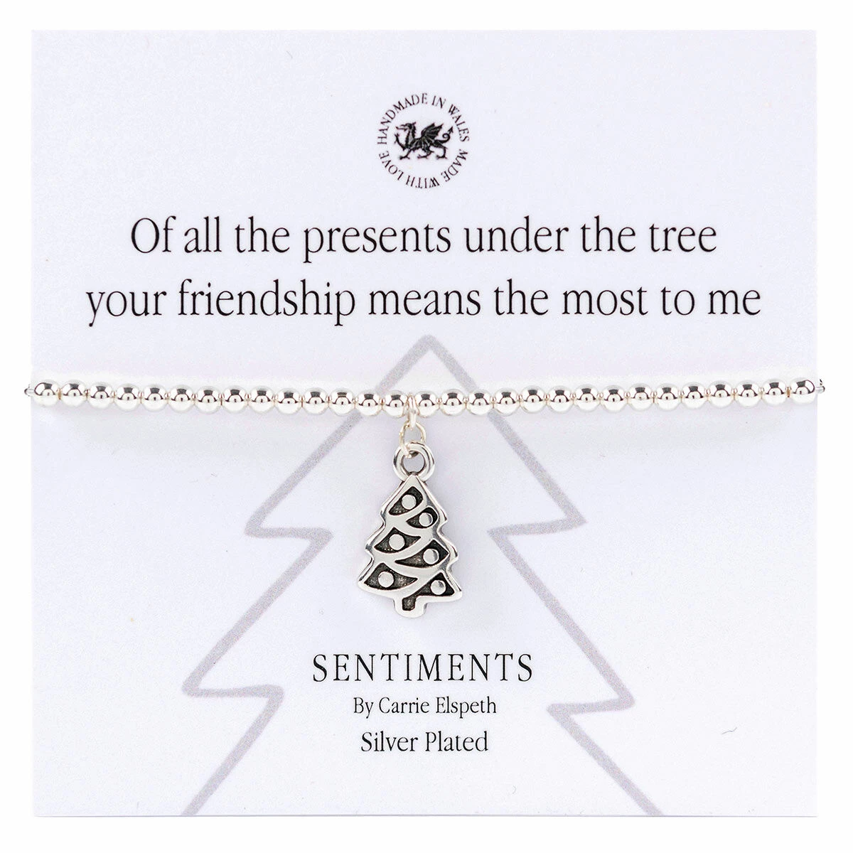 A ‘sentiment’ card is included with the bracelet, with the message; ‘Of all the presents under the tree your friendship means the most to me’ with a single illustrated grey heart.