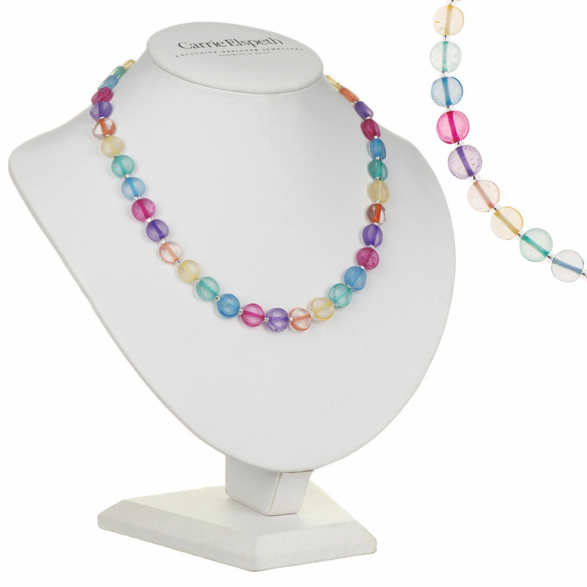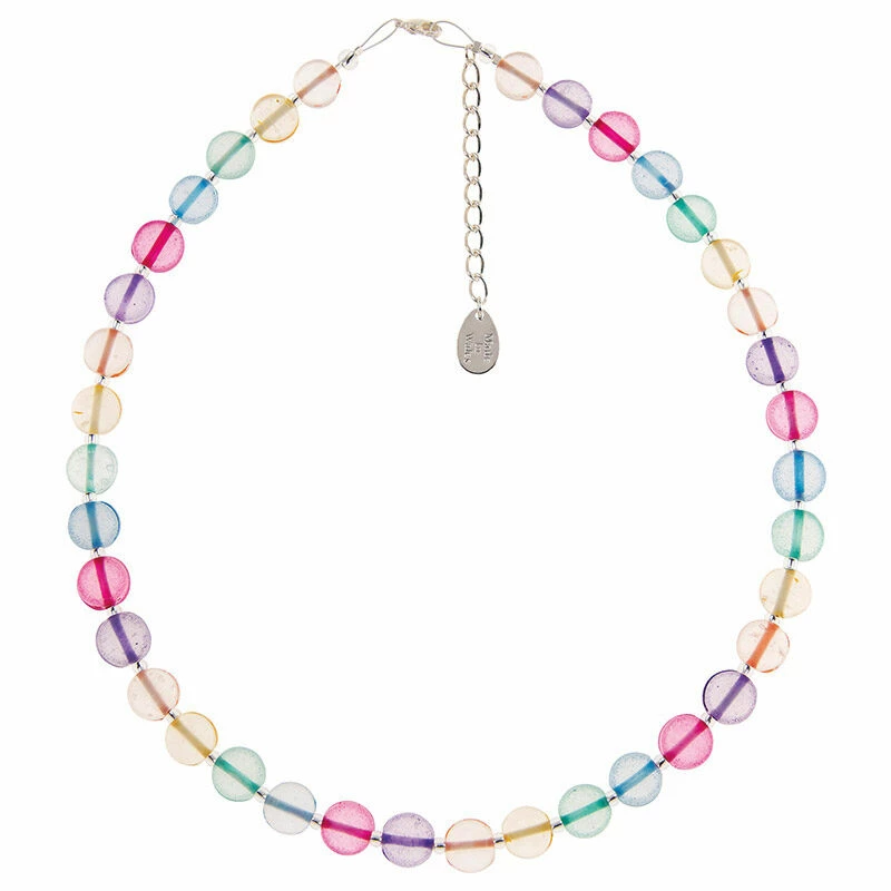 This beautiful accessory from Carrie Elspeth features pastel candy spheres which alternate with small clear spacer beads, allowing the colours to stand out. The beads form a rainbow of delicate colour made from frosted glass and are strung onto a thin piece of wire making the necklace elegant and sophisticated, suitable for any time of day, morning, or night. The necklace will add a touch of colour and interest to your outfit, suitable for any occasion.