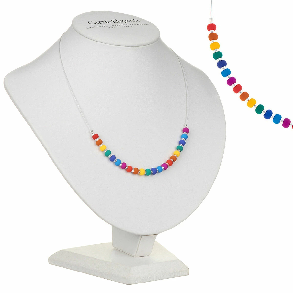 Add some multicolour to your jewellery collection with this rainbow carnival links necklace from Carrie Elspeth. A vibrant and stylish accessory perfect for day, night or any occasion! The piece of jewellery is made up of glass beads in a rainbow of vibrant colours yellow, orange, red, purple, blue and green. They all have a matt finish and in between each one is a smaller, clear spacer bead which are strung across the front or the wire.