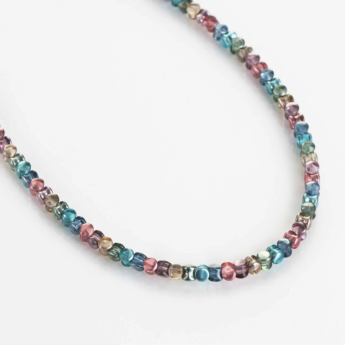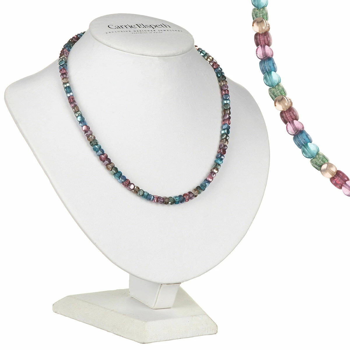 Add a pop of colour to any outfit with this stunning necklace from Carrie Elspeth made from Czech glass beads in subtle rainbow hues, designed in an unusual shape so they all sit snuggly together.