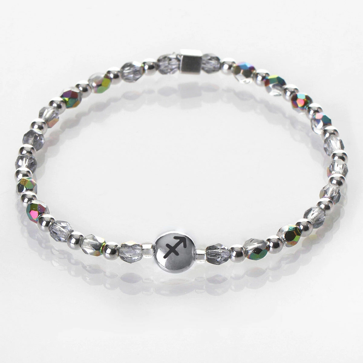 Send heartfelt thoughts to a Sagittarius friend with this charming bracelet from Carrie Elspeth. The zodiac bracelet features shimmering Czech beads spaced with silver beads, and a cute silver-plated charm bead with the Sagittarius zodiac symbol embossed on the front which hangs in the middle. The bracelet stretches to fit over your wrist allowing it to be put on and taken off with ease.