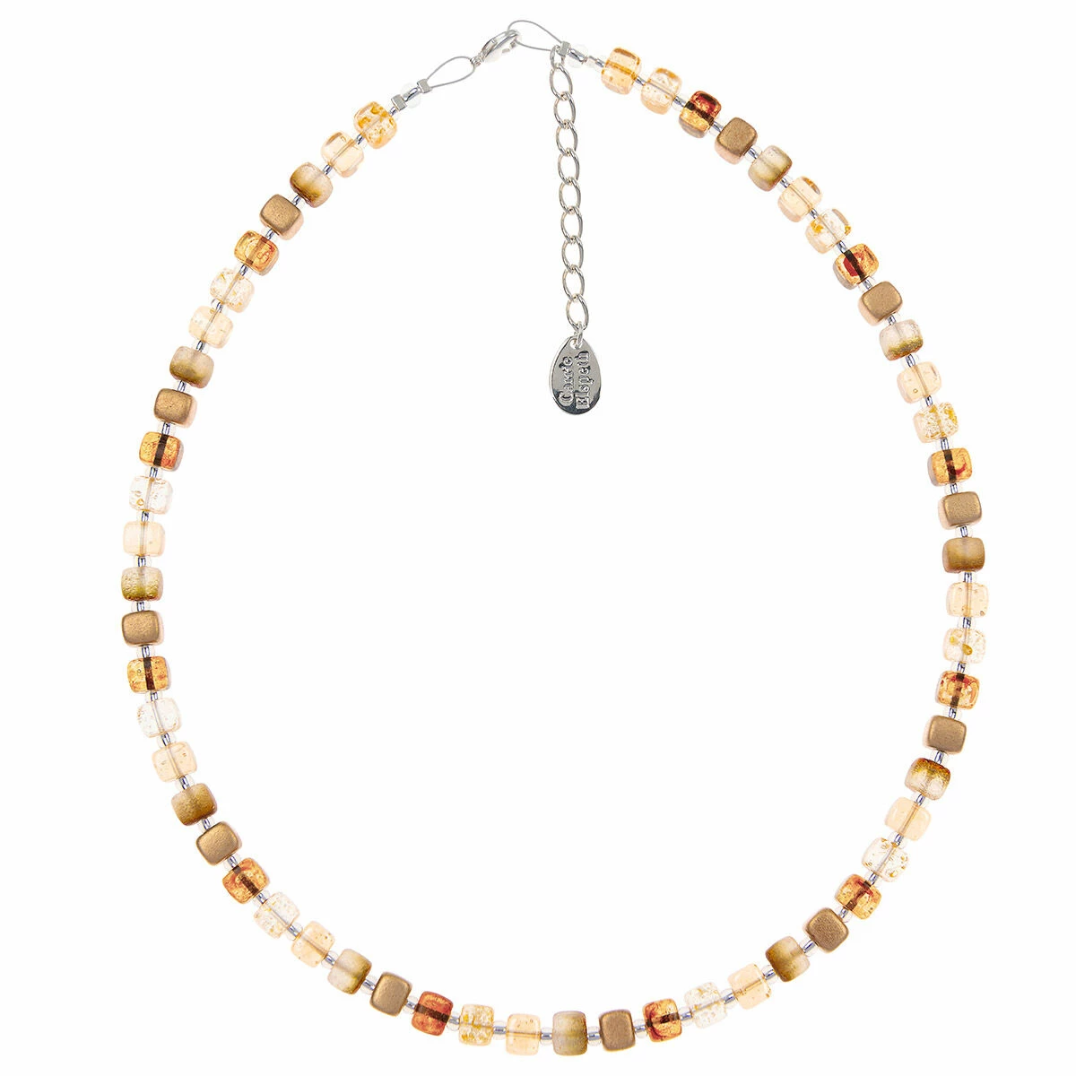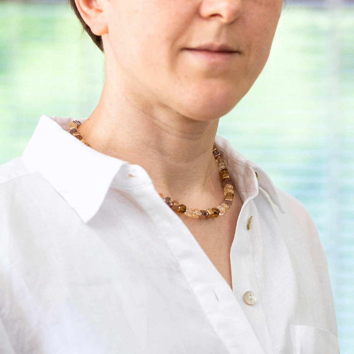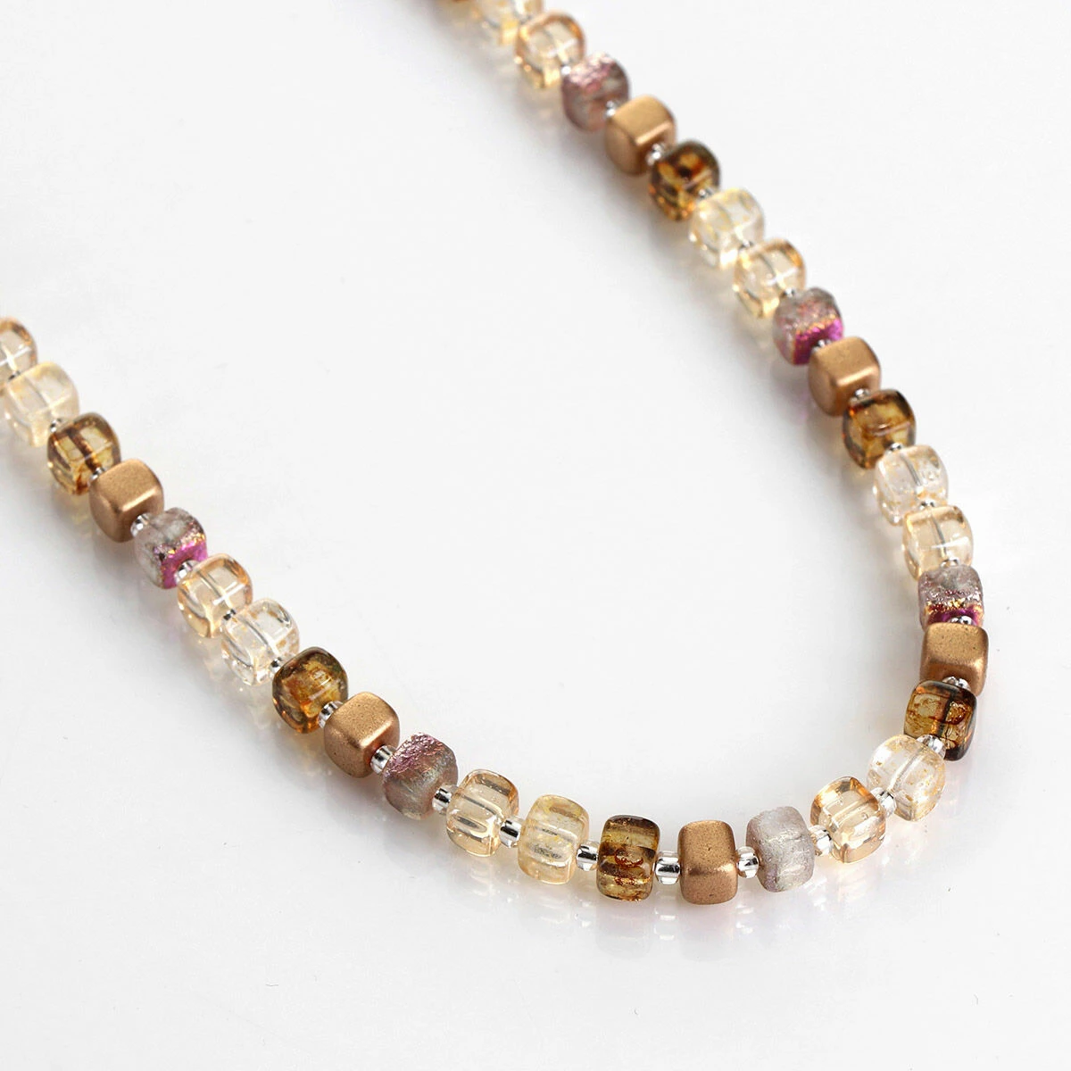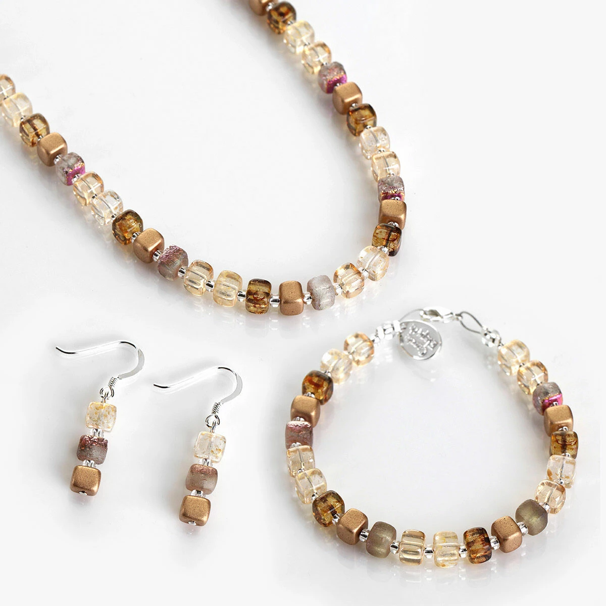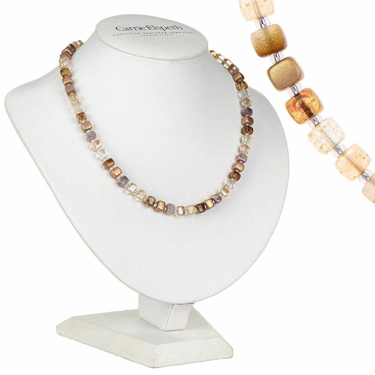 This chic glass sandstone necklace from Carrie Elspeth features stunning recycled glass cube beads. The beads feature an array of soft sandstone hues in a variety of finishes, making them shimmer and dance in the light. Each bead alternates with a small clear glass spacer bead.