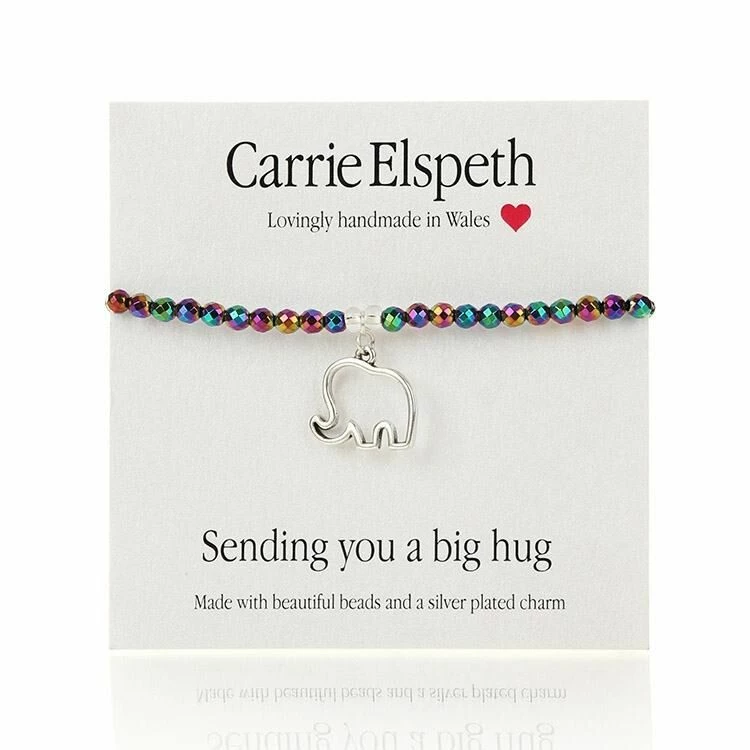Send a special message with this beautiful bracelet from Carrie Elspeth. The bracelet features coloured Czech beads and a cute silver plated elephant pendant attached between two clear beads. The bracelet stretches to fit over your wrist, meaning you can easily take it on and off to accessorise your outfit.