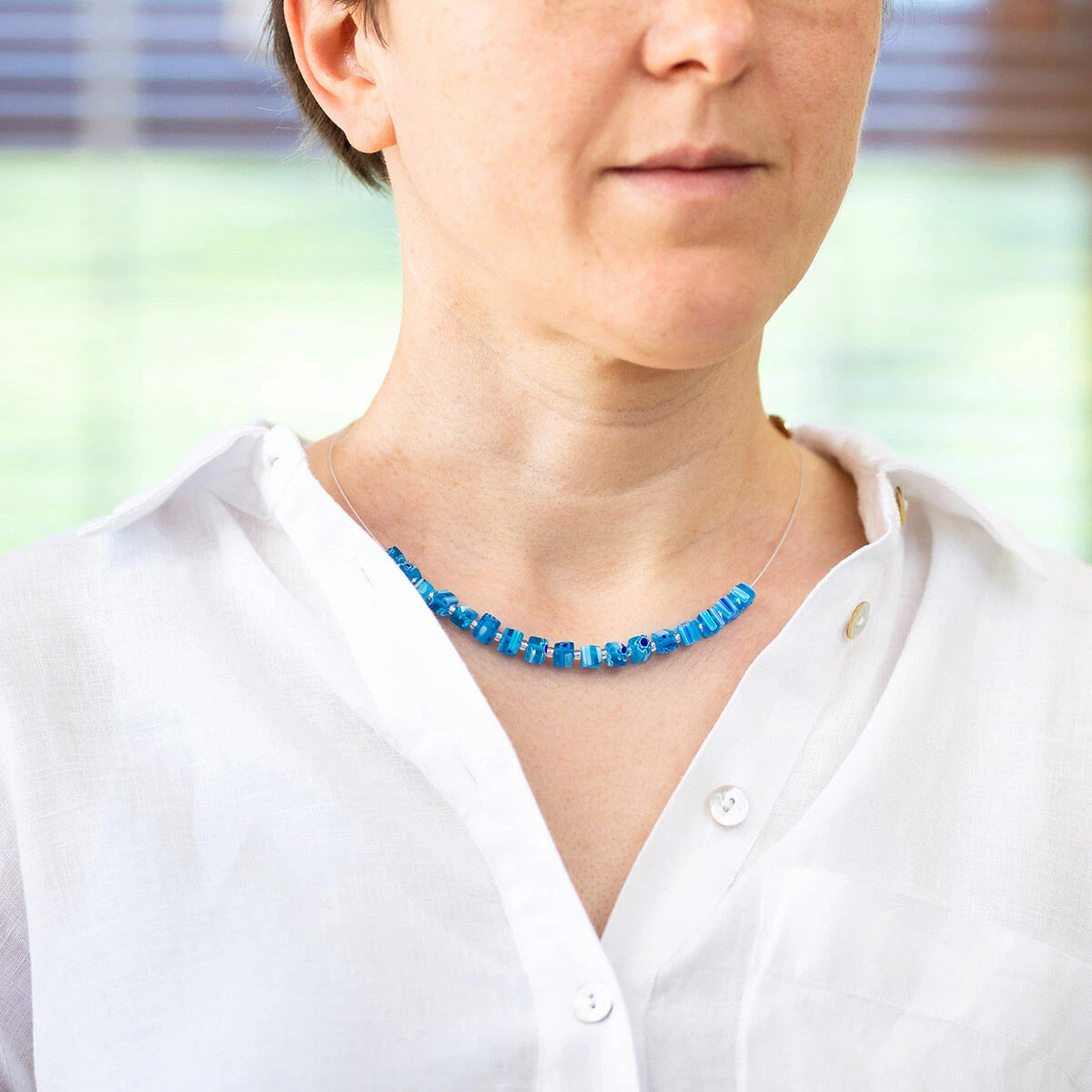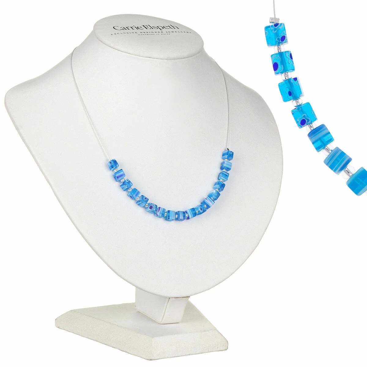Perfect for the spring and summer months, this stunning half beaded necklace from Carrie Elspeth is made with Millefiori glass beads in beautiful blue hues, interspersed with glass seed beads. Each Millefiori glass cube bead features a uniquely individual design of tiny flowers and stripes running through.