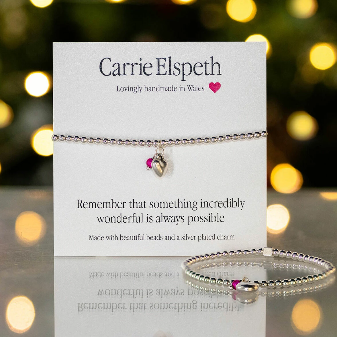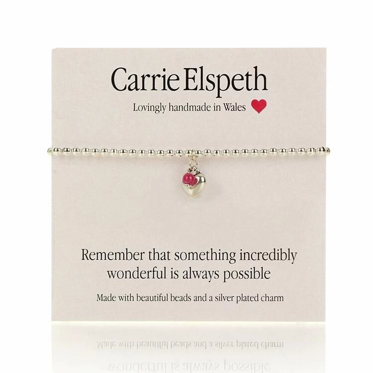 Let a friend or loved one know you care with this beautiful bracelet from Carrie Elspeth. The bracelet features silver Czech beads and a cute, silver plated heart pendant with an attached pink bead. The bracelet stretches to fit over your wrist, meaning you can easily take it on and off to accessorise your outfit.