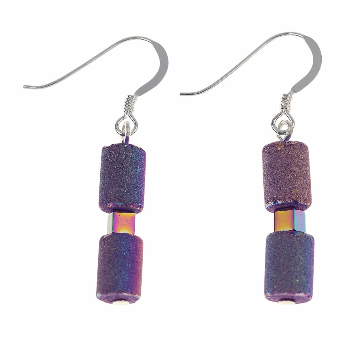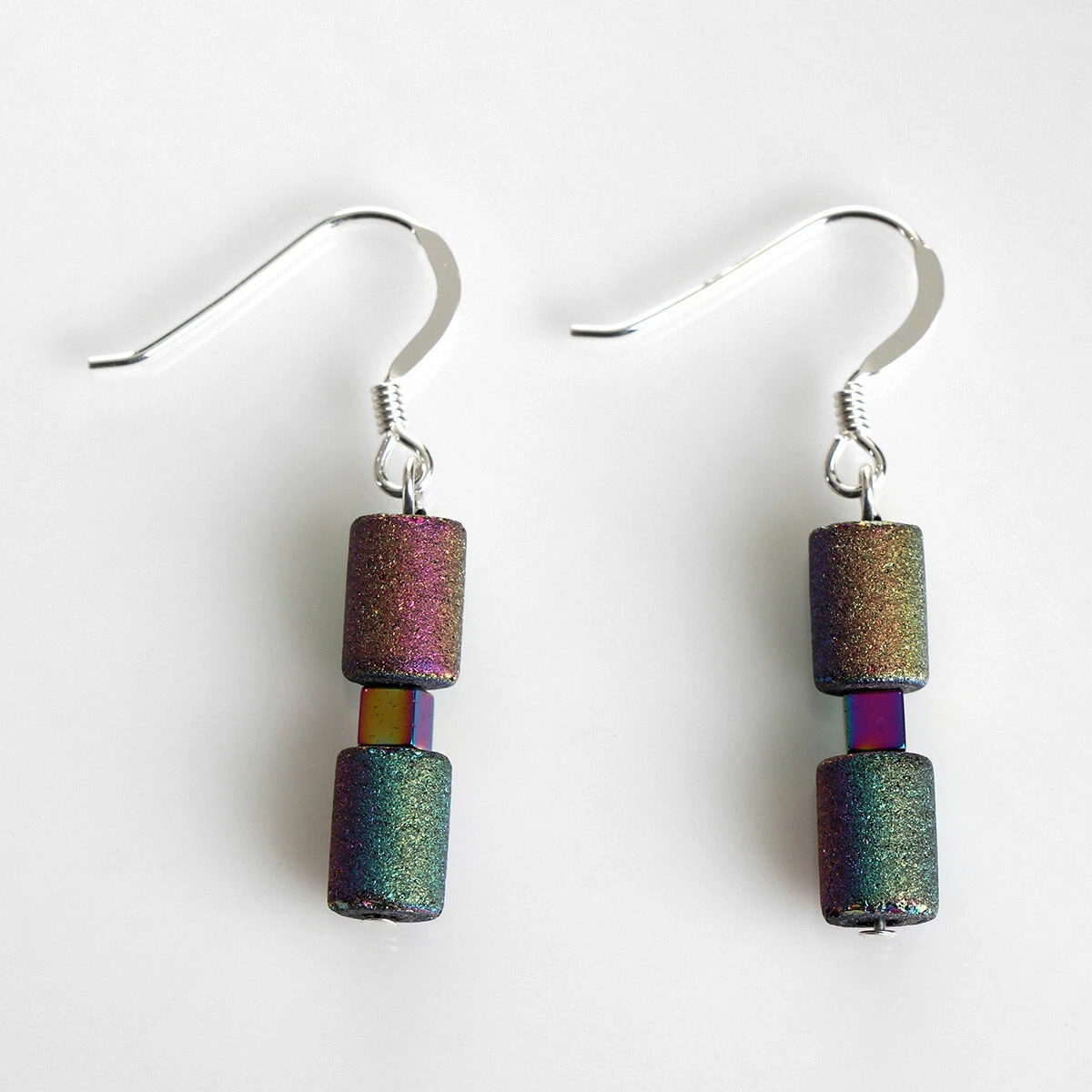 Add a glimmer of sparkle to your outfit with these stunning spectrum lava glimmer earrings from Carrie Elspeth. The gorgeous drop earrings are beautifully made with fired glass, barrel beads in the shape of a small cylinder with a glittering finish. They feature three, small cylinder beads which are interspersed with spectrum cube spacer beads. They are strung on a thing piece of silver wire, allowing the statement beads to come into their own.
