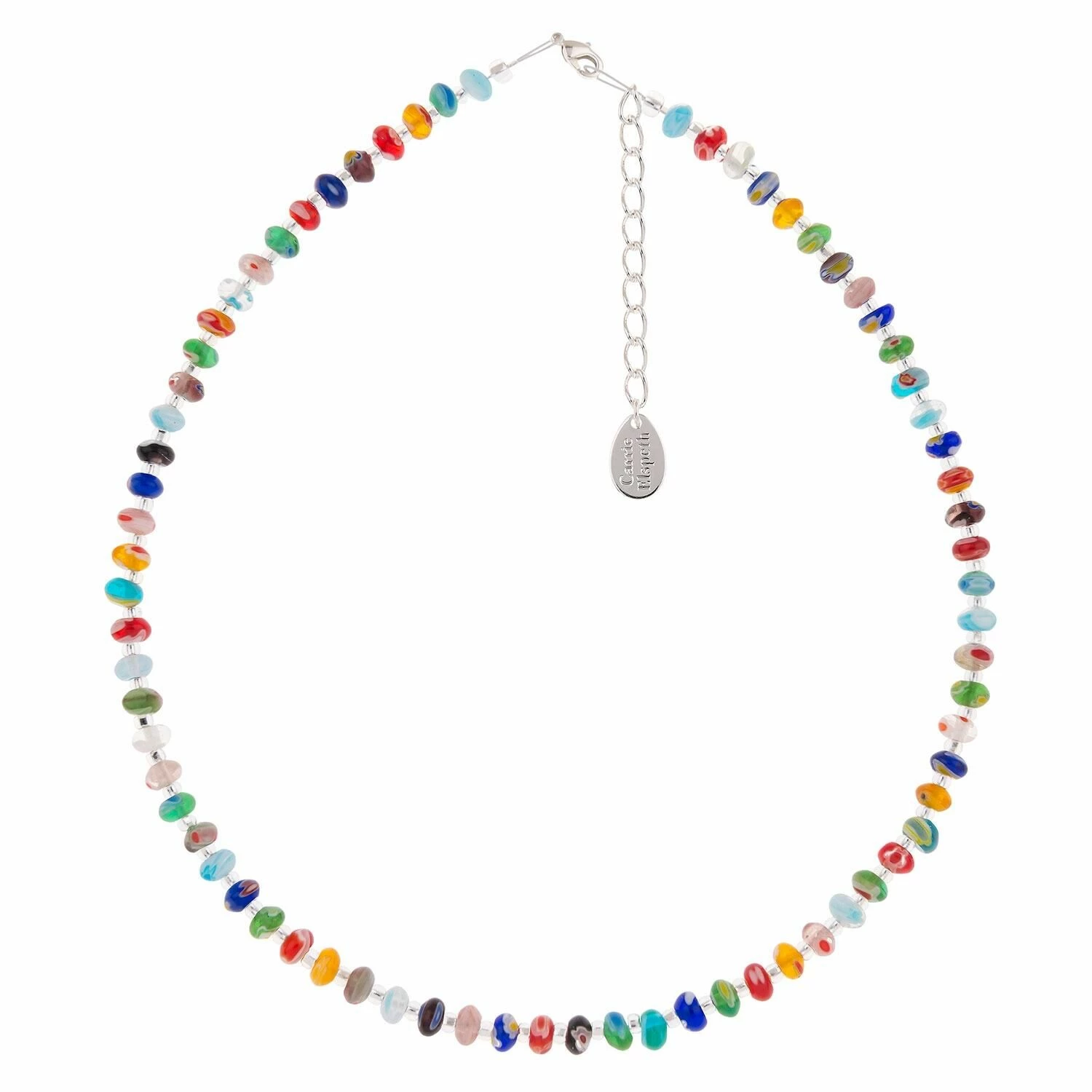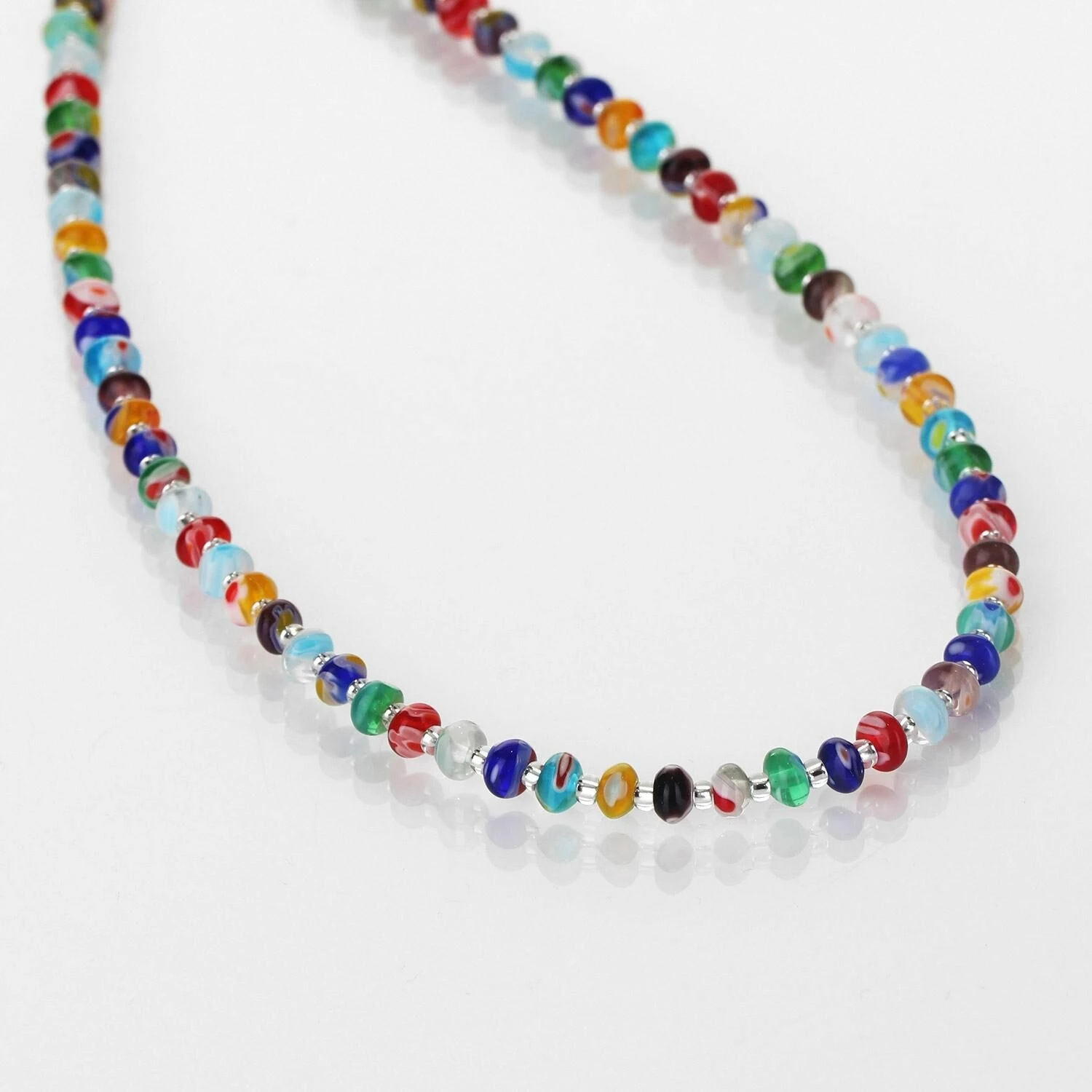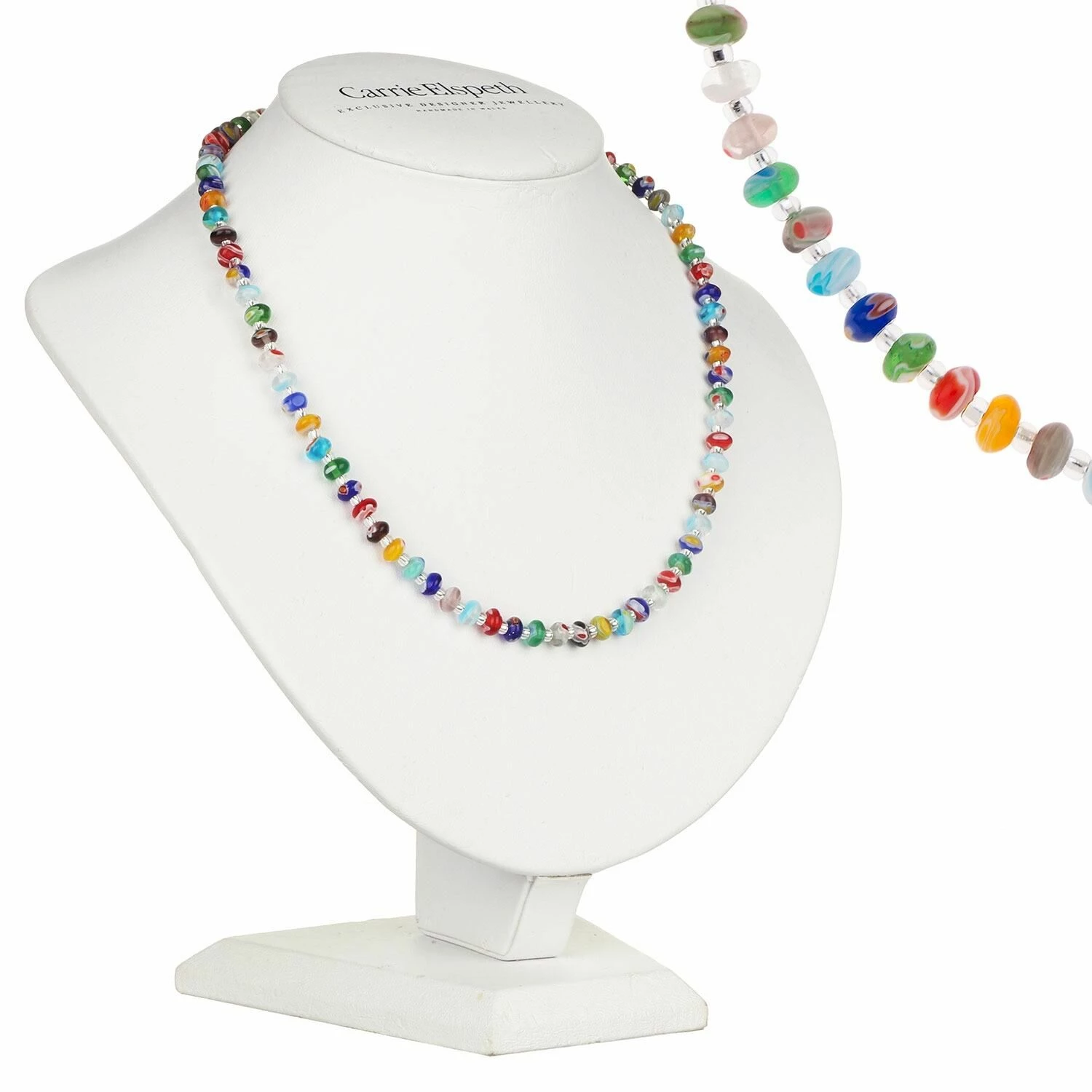 Add a touch of colourful millefiori rainbow to your jewellery collection with this stylish necklace from Carrie Elspeth. A stunning and delicate accessory for all occasions! Made from glass beads, a rainbow of millefiori beads cover the entirety of the silver wire. Between each colourful bead is a petit spacer bead to make the colours of the design pop. The beads are held in place with a small silver clamp at either end. This decorative necklace is perfect for any formal or casual event, and will add a touch of class to your jewellery collection. Combine with the matching earrings and bracelet to create a sophisticated look.