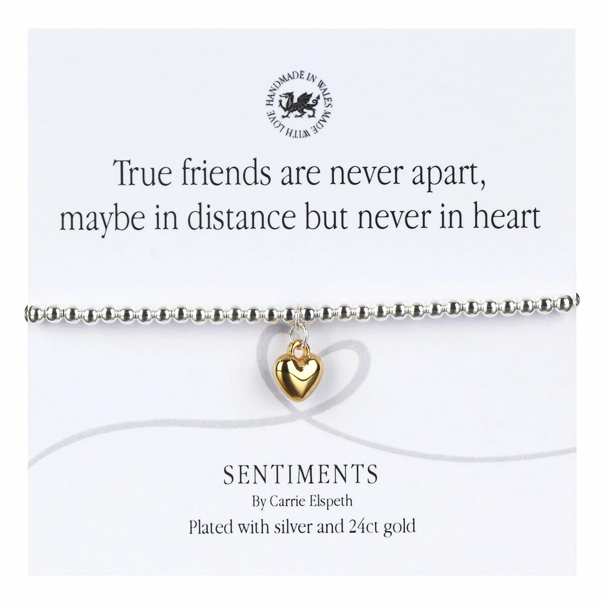 A ‘sentiment’ card decorated with a swirling heart is included with the bracelet, with the message; ‘True friends are never far apart, maybe in distance but never in heart’.