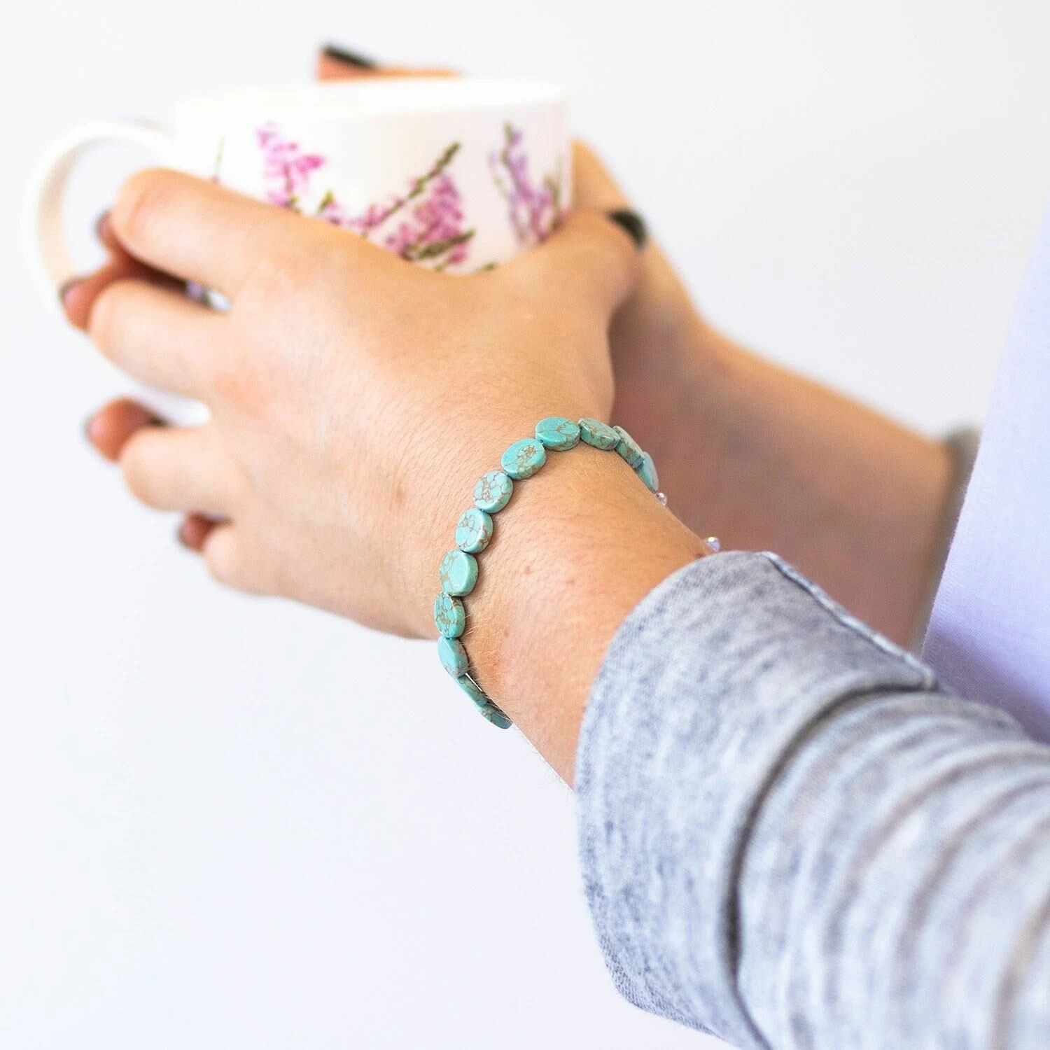 This delicate bracelet from Carrie Elspeth is the perfect, dainty accessory for any time of year! It is made from beautiful, turquoise, coin shaped beads which are strung in the middle of a thin piece of silver wire. The wire is held in place with small silver clamp which is decorated with two clear beads either side. This stunning bracelet will add a touch of class to your jewellery collection and is perfect for pairing with both formal and casual outfits. Combine with the matching earrings and necklace to create a sophisticated look.