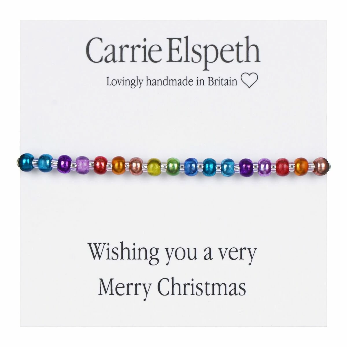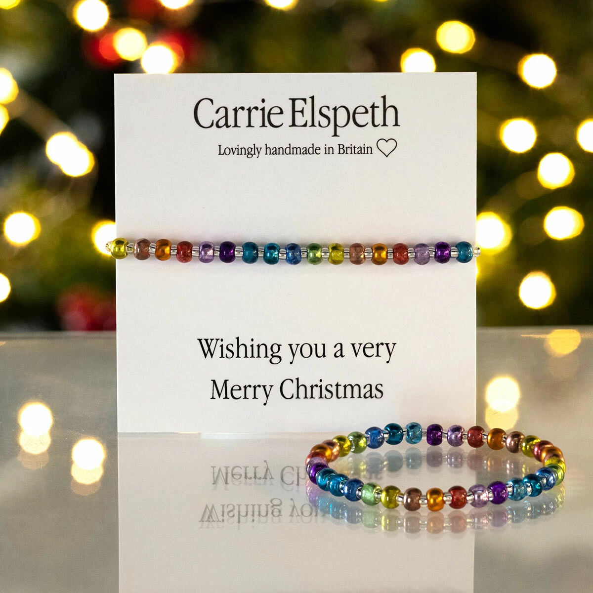 Send a special message this Christmas with this beautiful bracelet from Carrie Elspeth. The bracelet features a rainbow of multicoloured Czech beads alternating with petit silver spacer beads that make the design ‘pop’. The bracelet stretches to fit over your wrist, meaning you can easily take it on and off to accessorise your festive outfit.