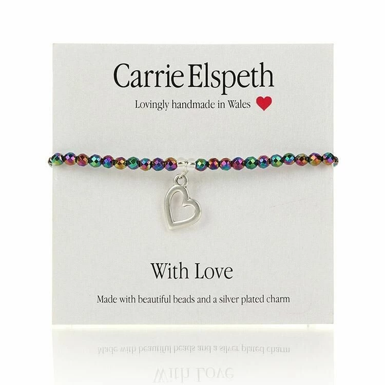 Send a special message with this beautiful bracelet from Carrie Elspeth. The bracelet features colourul Czech beads and a cute silver plated heart pendant attached between two clear beads. The bracelet stretches to fit over your wrist, meaning you can easily take it on and off to accessorise your outfit.