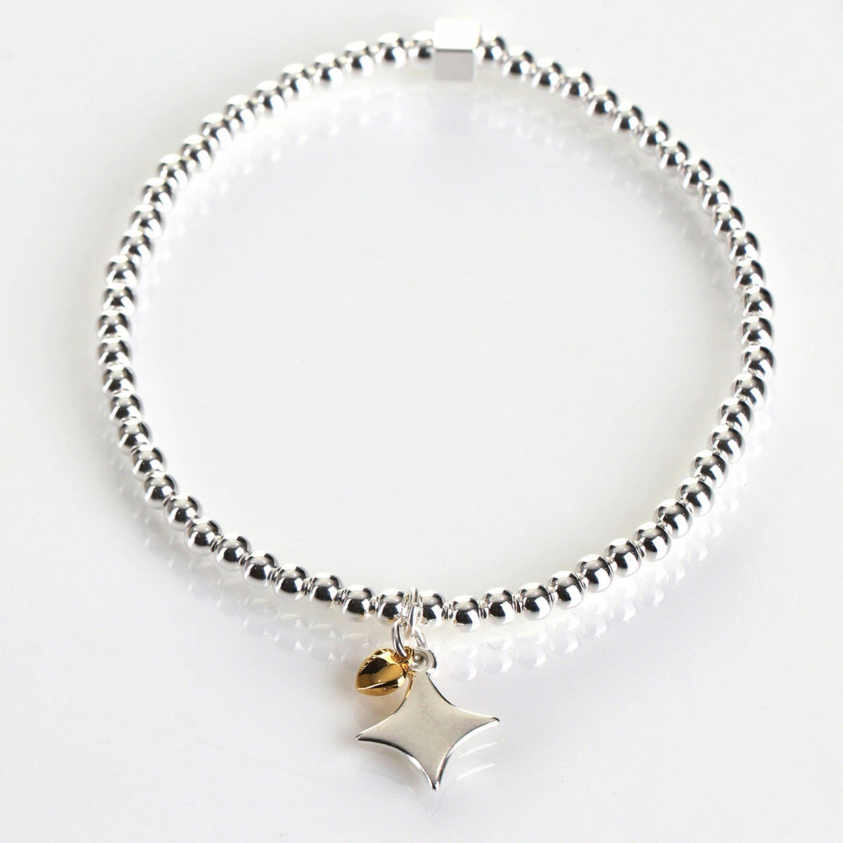 Show someone special just how much you cherish them with this utterly charming bracelet from Carrie Elspeth. The bracelet features silver beads and a silver-plated star charm which hangs in the middle, nestled beside a smaller gold-plated heart charm that shimmers in the light. The bracelet stretches to fit over your wrist allowing it to be put on and taken off with ease.