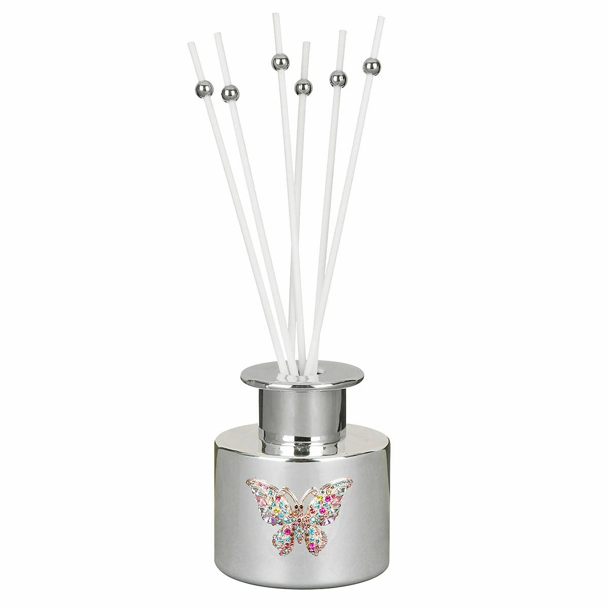Presented in a clear glass jar with six white reeds, this diffuser is ideal for adding a shimmering touch to any room’s décor. The silver glass jar is ornate in its design with a rose gold butterfly on the front. The butterfly is embellished with beautiful, colourful diamantes that sparkle in the light. It comes with a matching silver lid and the white reeds are decorate with simple, silver beads.