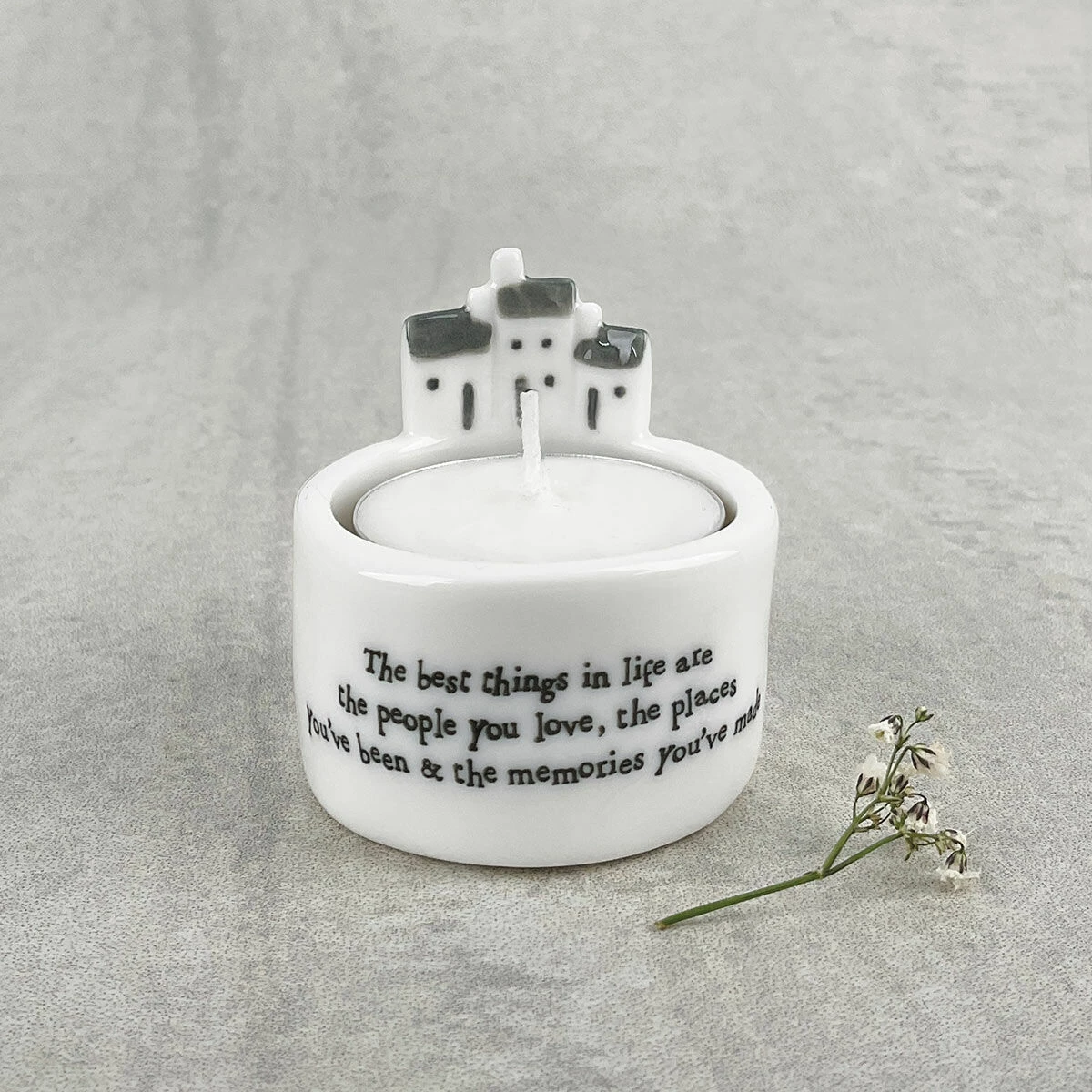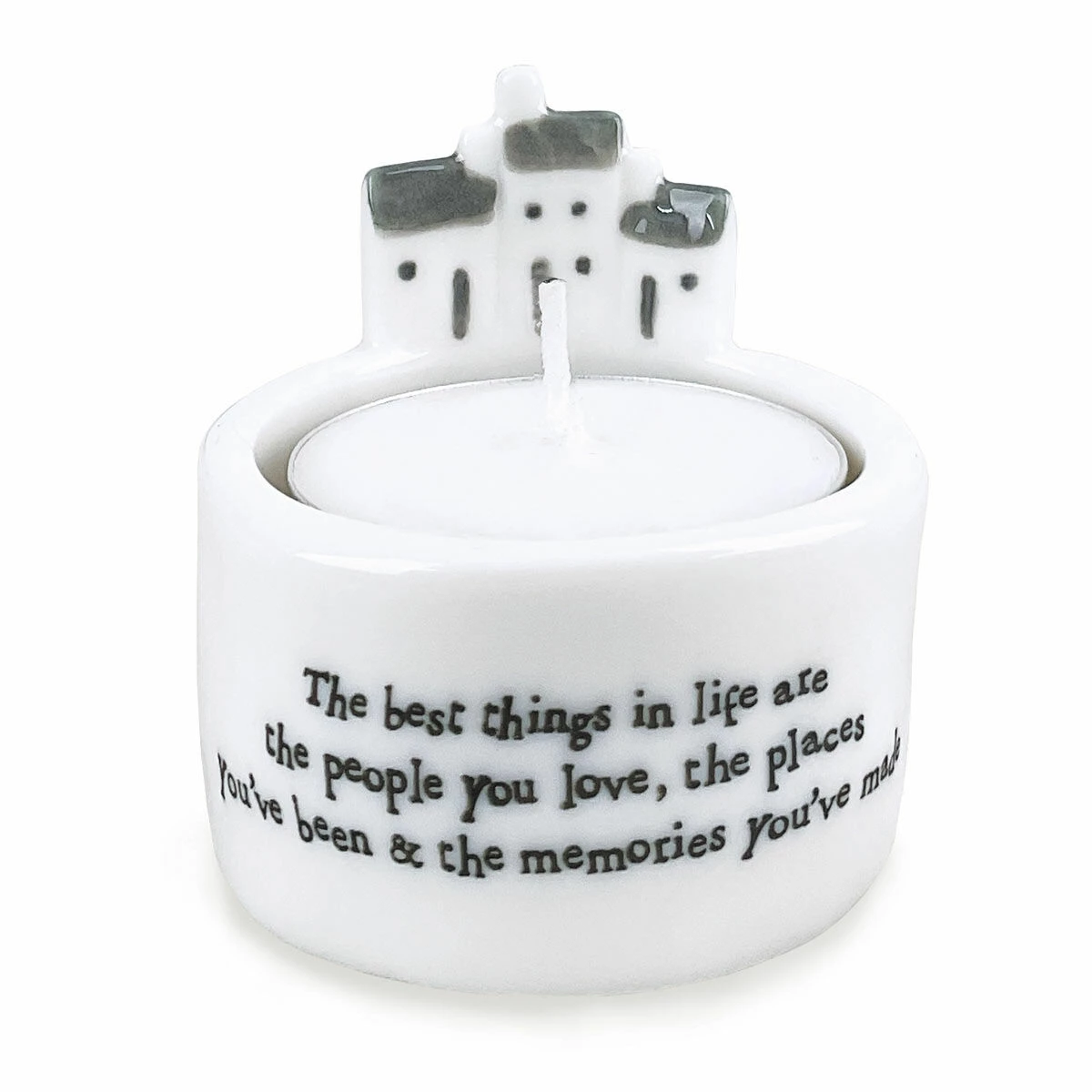 Made from ceramic this white coloured candle holder features a small house and tree on the rim of the holder. Complete with text at the front which reads ‘The best things in life are the people you love, the places you’ve been & the memories you’ve made’. It is presented in a beige coloured box which is decorated with the same design that is on the candle holder.