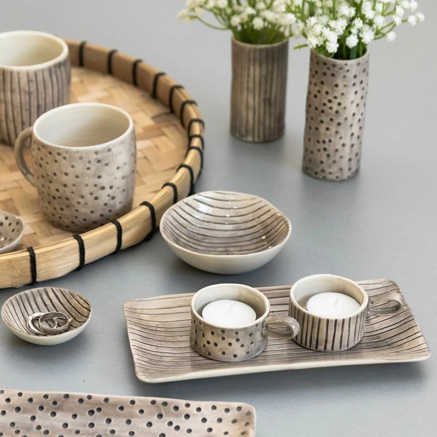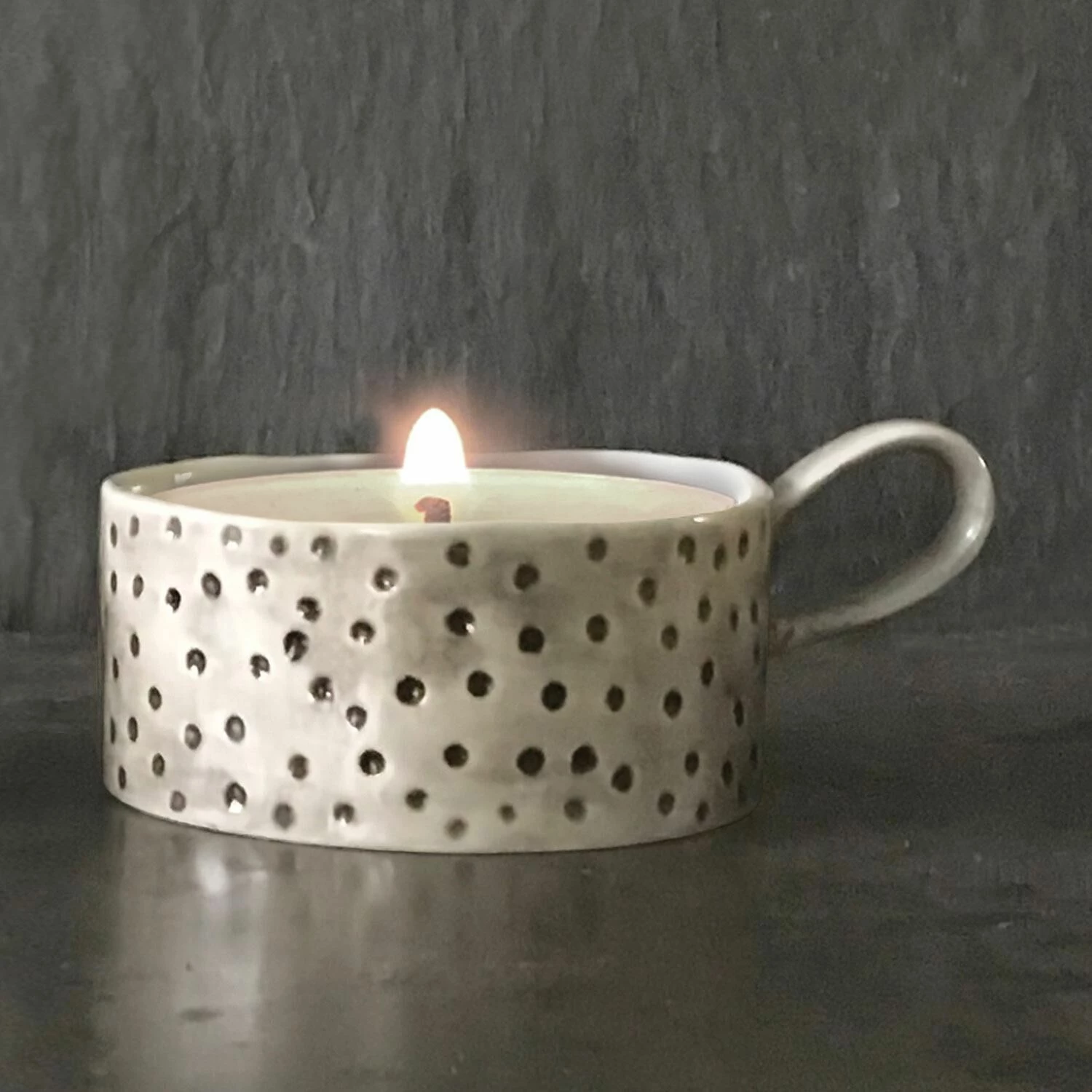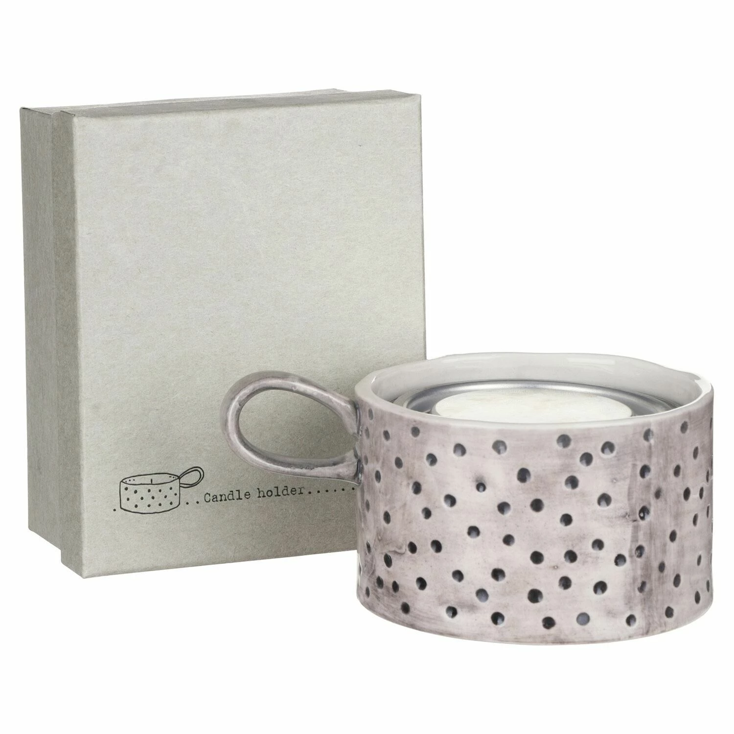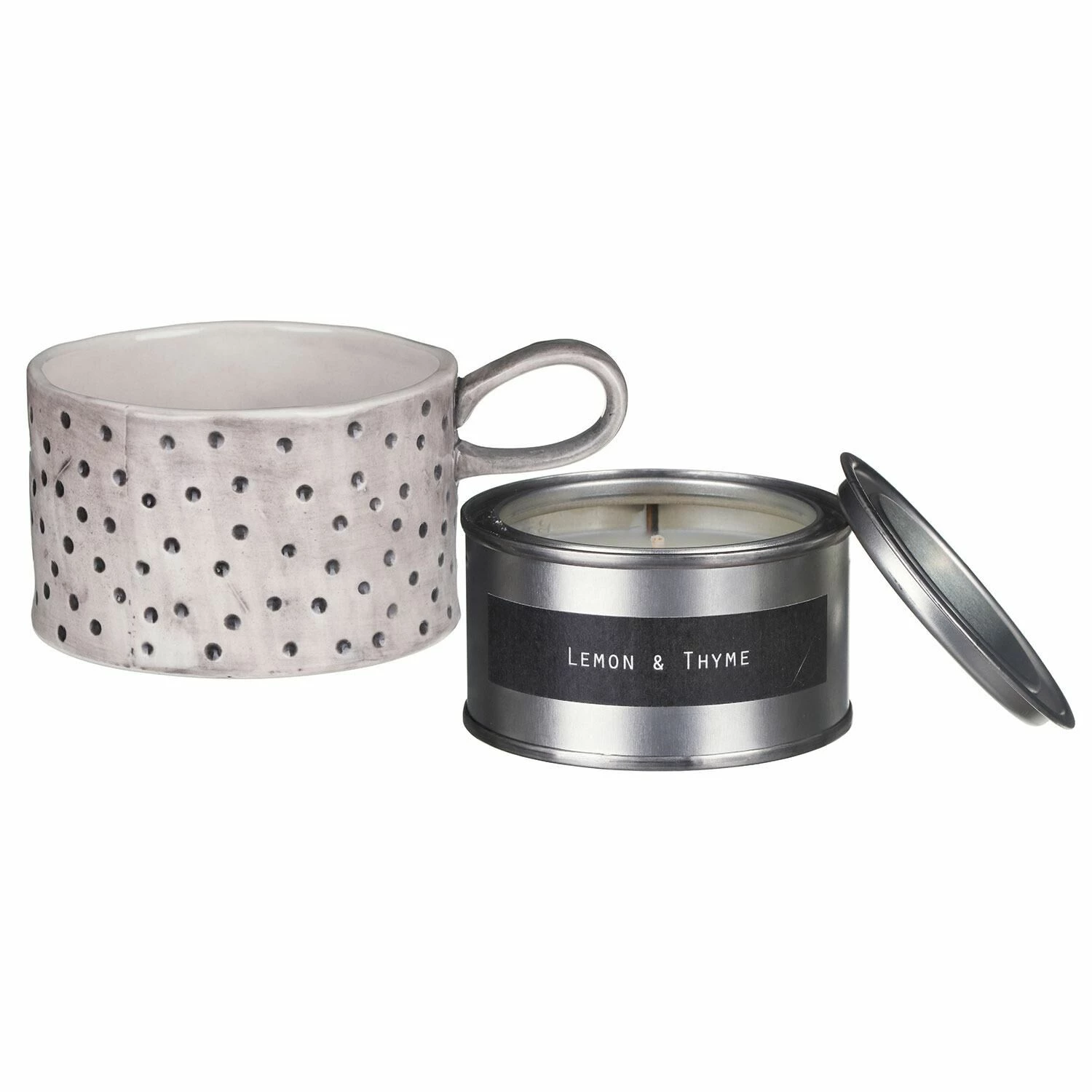 This taupe ceramic candle holder is coloured washed taupe and features polka-dots, etched into the surface in a freestyle fashion so each one is unique. Included with this ceramic vessel is a Lemon and Thyme scented candle, which comes in a tin to sit perfectly inside, with a burn time of 14 hours, that will create a relaxing ambience.