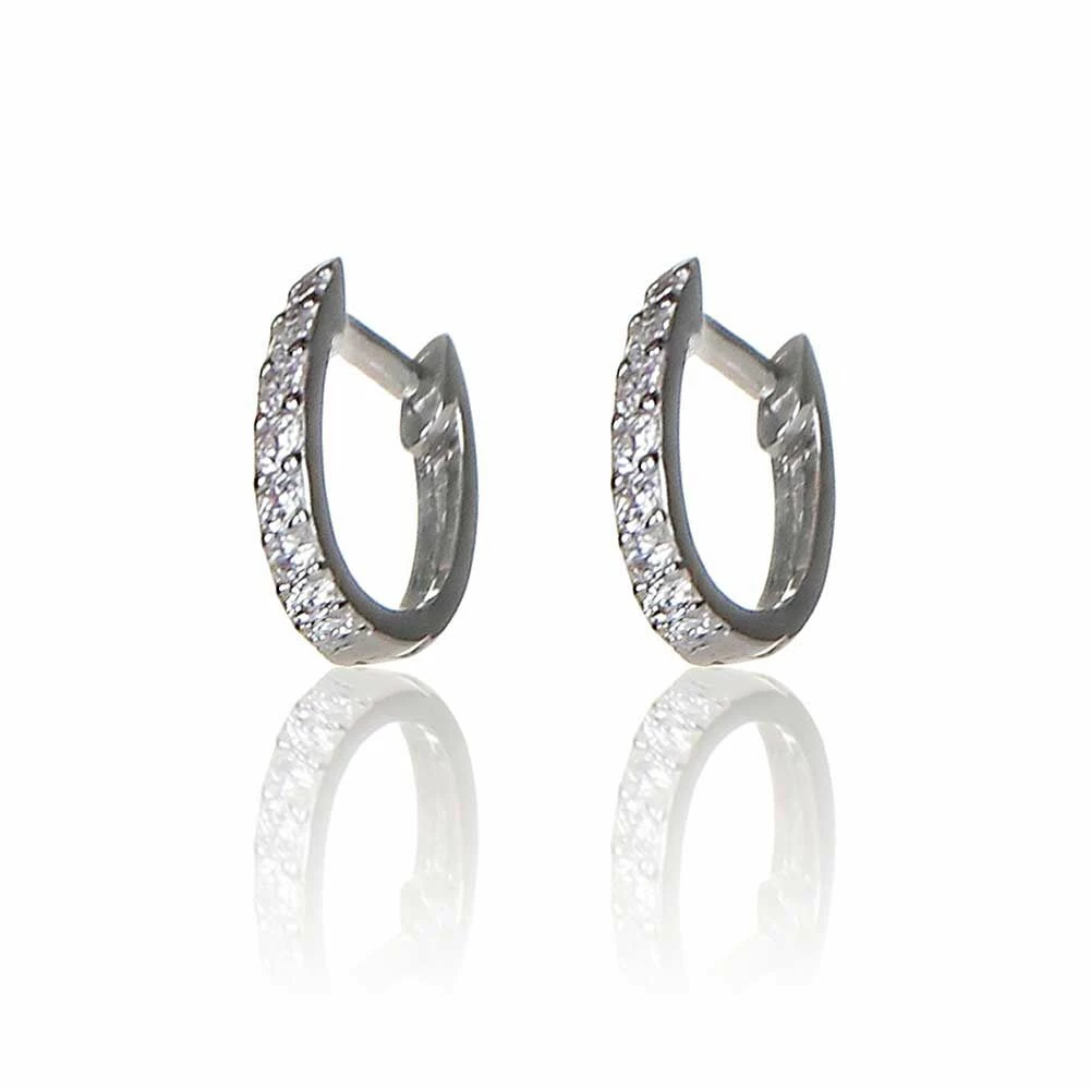 The earrings feature cubic zirconia gems, set in sterling silver, which sit along the front of the loop. Small and delicate, these hoops are just 11mm in length, and add a touch of sparkle to your outfit. Understated yet timelessly elegant, this pair of loop earrings superb for any occasion, great for everyday wear, a special event, or to compliment an evening outfit.
