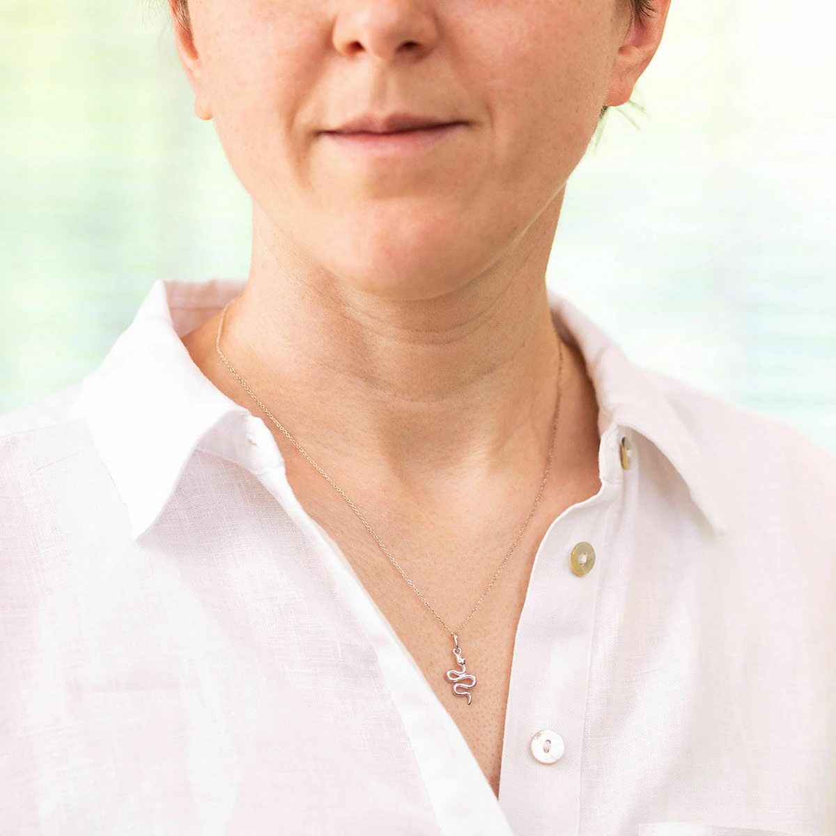 This beautiful pendant is a stunning accessory, designed as a delicate slithering snake. The simple snake is curled up, creating a striking design. The snake pendant hangs from a fine silver chain which measures 40cm long and has an extension chain of 5cm. This elegant and sophisticated piece of jewellery is suitable for any occasion, day and night.