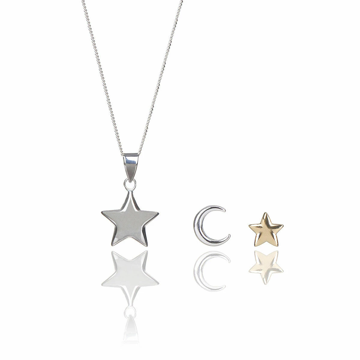 This beautiful Star and Moon two-piece set from the Elements Collection makes the perfect gift. This set includes a silver necklace and pair of stud earrings. The necklace features a star shaped pendant which is made from silver with a ‘puffed’ three-dimensional appearance. This unique set features two separate stud earrings; a silver crescent moon and a gold star. These simple, yet stylish earrings are the perfect accessory to complete your outfit.