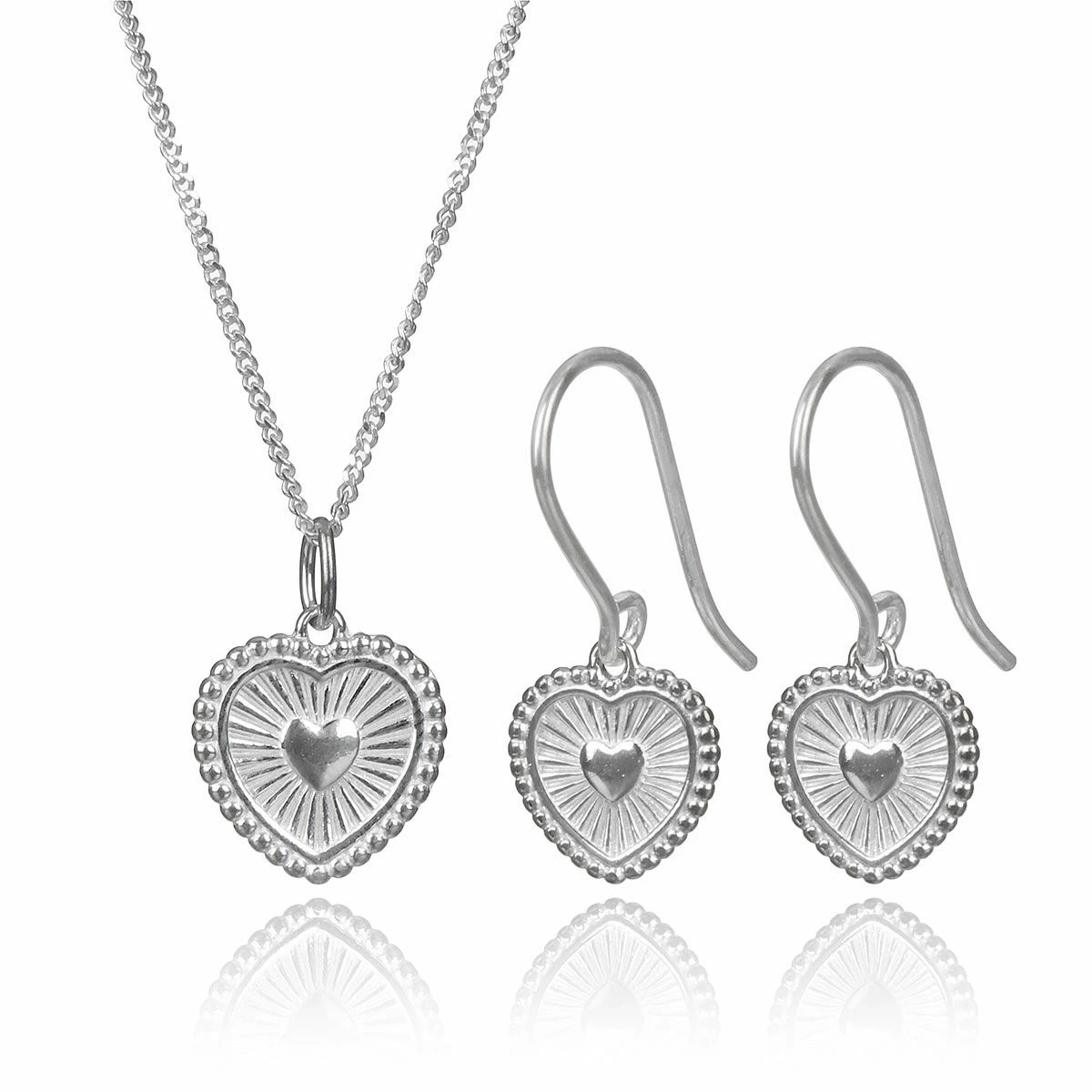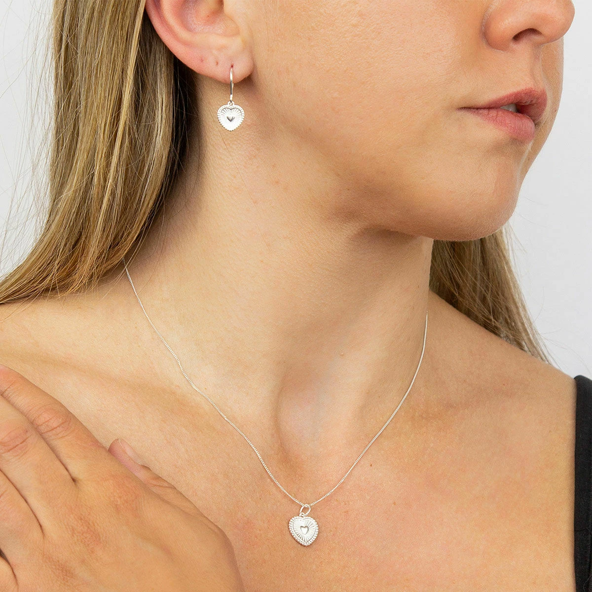 This beautiful Sun Ray Textured Heart two-piece set from the Elements Collection makes the perfect gift. This set includes a matching silver necklace and pair of drop earrings. Each piece of jewellery features a beautiful pendant which is shaped like a little heart. The heart has rays coming out of the centre, emulating the sun’s rays.