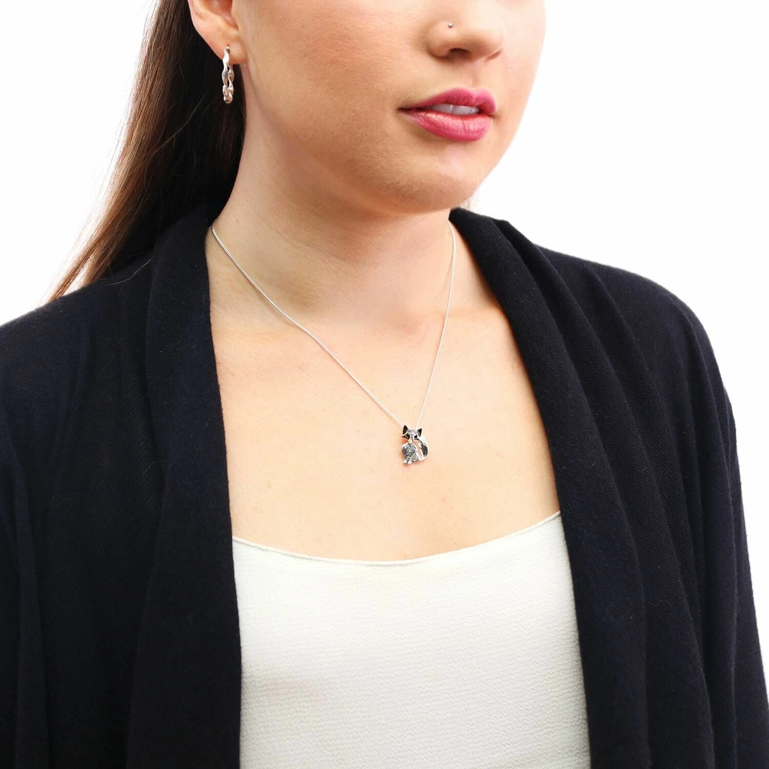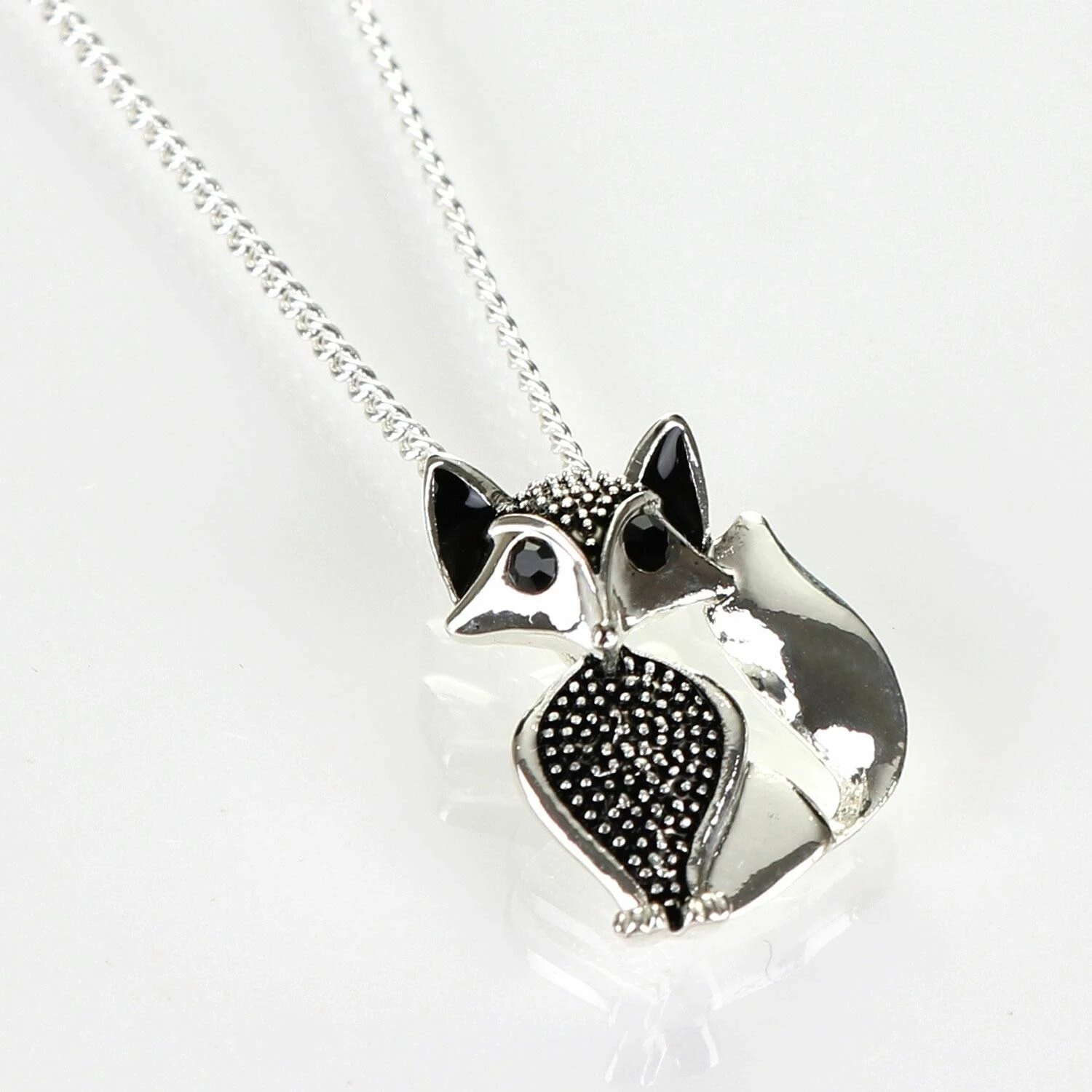 Hanging from a silver plated link chain, the silver fox is depicted seated, with it tailing curling towards it head. The ears are alert and eyes wide, and the head and chest are finished with a stippled effect for texture. It has two black gems for eyes. The necklace fastens using a simple hook and clip mechanism and features a 5cm extension chain. This enchanting piece of jewellery is simple yet eye-catching and the perfect gift to show loved ones just how much they mean to you for birthdays, Christmas or Mother’s Day.