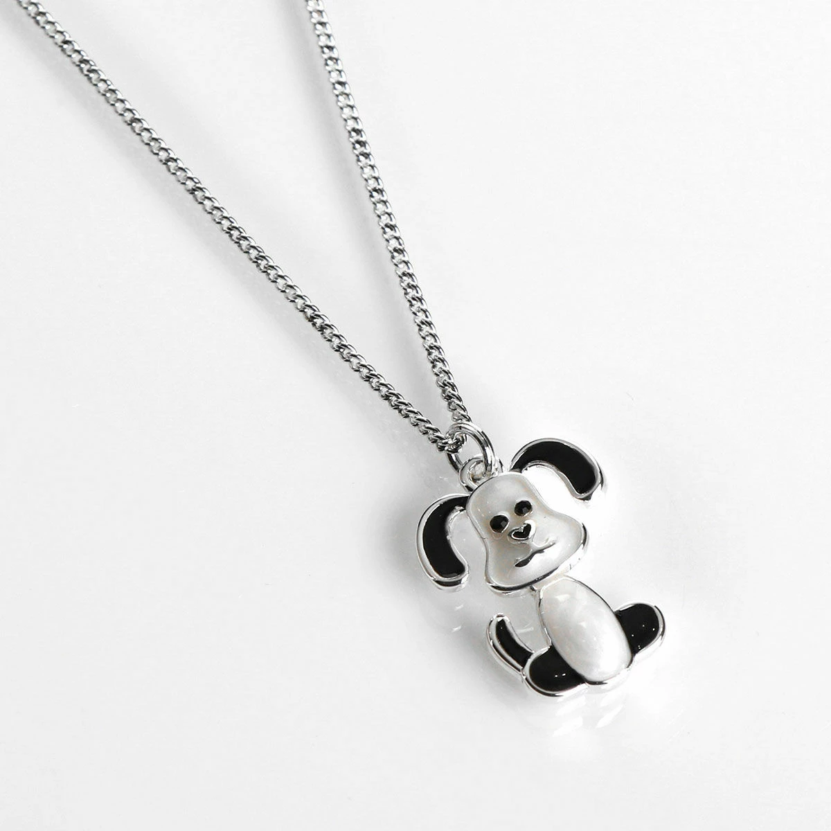 An adorable dog pendant with a cute white face and long black ears, beneath the head of this dog the body hangs allowing it to move freely as you move. The cheerful little dog pendant hangs from a silver chain which is approximately 39cm in length and fastens with a clip and loop mechanism. There is also an extension chain which allows you to adjust the length to your liking.