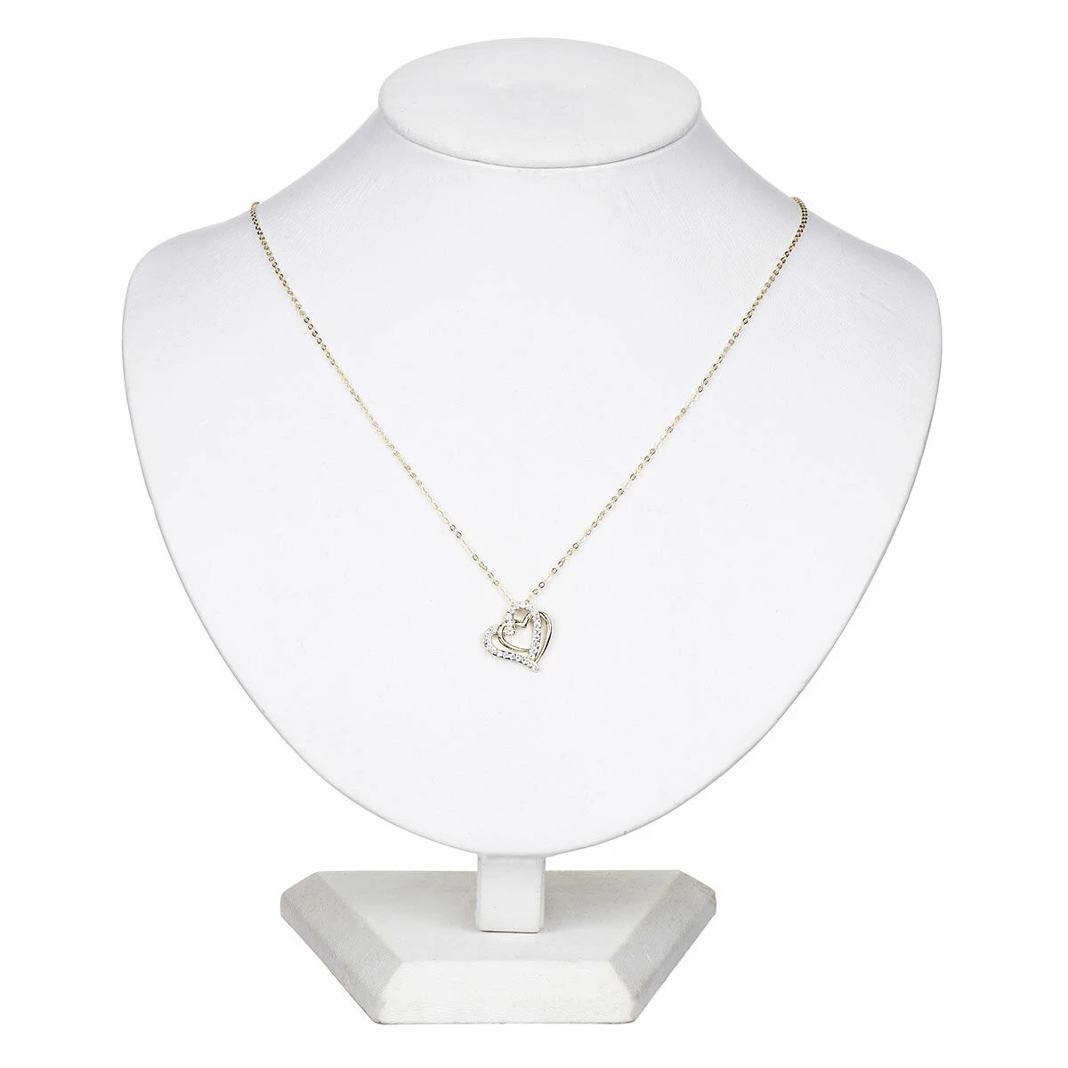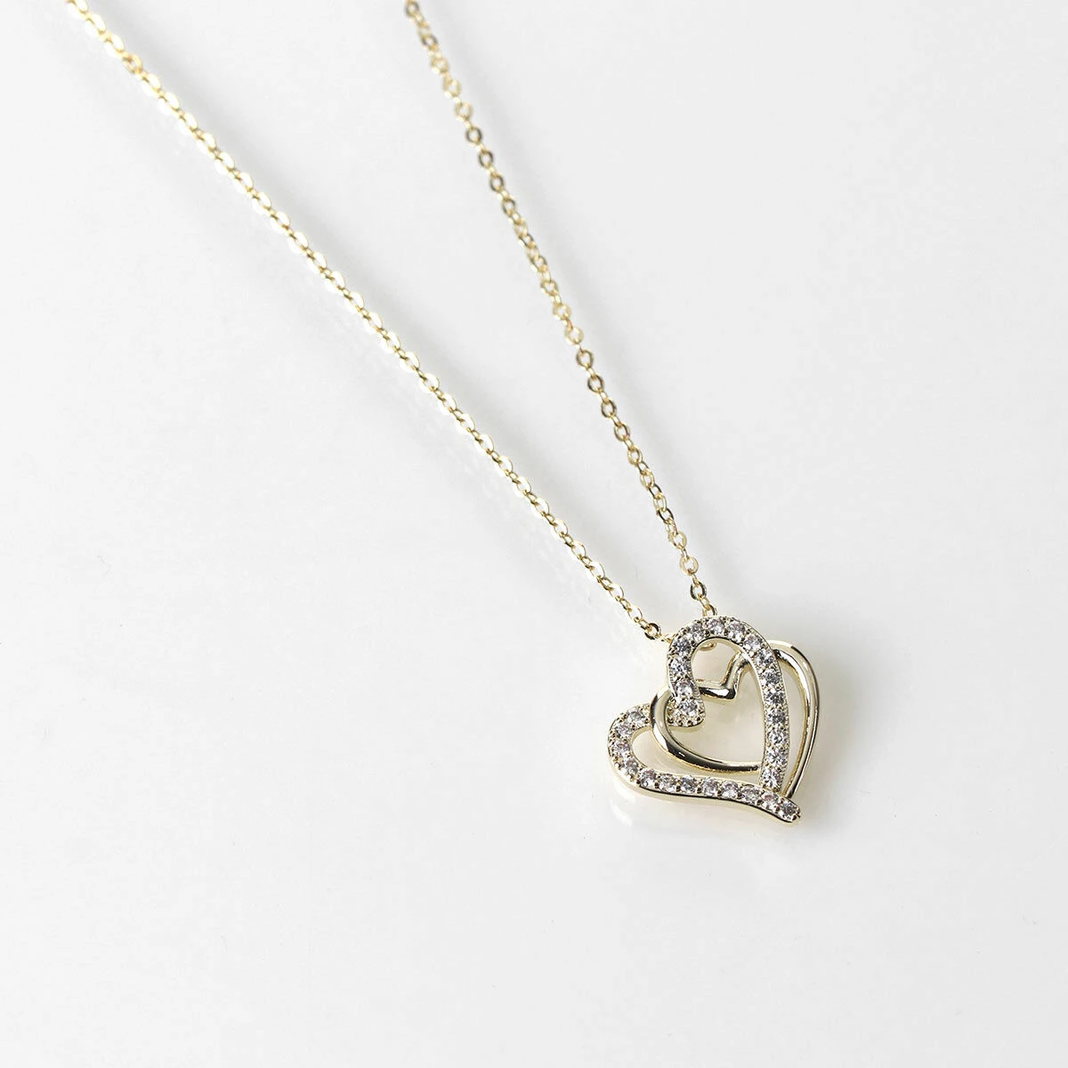 The stylish entangled hearts necklace is designed with a single pendant made up of two heart outlines which entangle together. One heart is smooth gold, and the other is encrusted with multiple clear gemstones. The pendant sits on a fine chain which fastens with a hook and eye clasp along with an extender chain allowing you to wear it at the desired length you wish. The chain is 46cm in length and features a hook and eye clap with extender chain for you to adjust to your desired length.